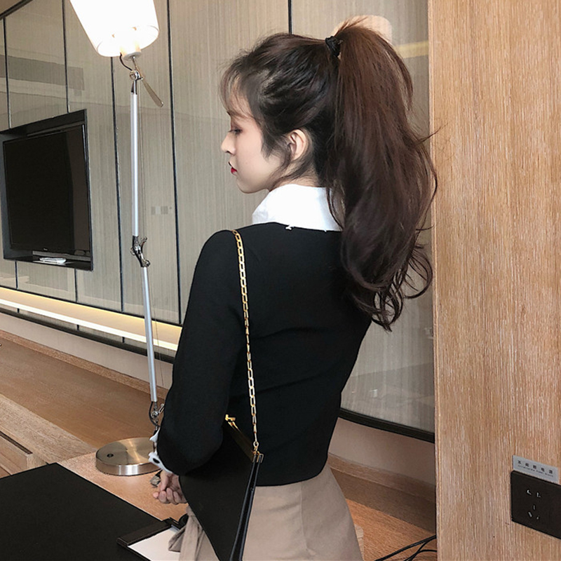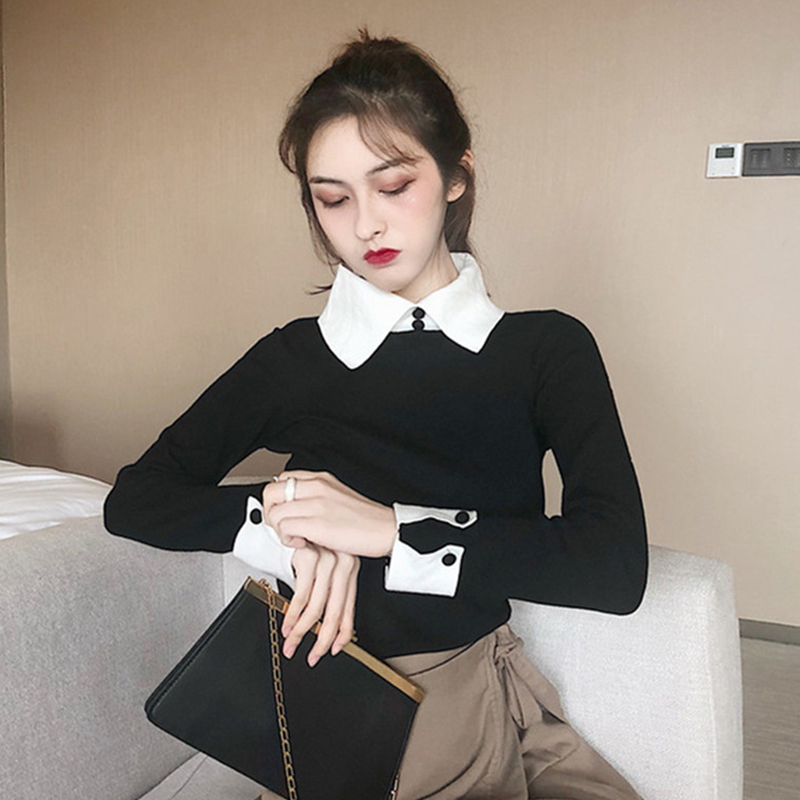 冷系修身針織衫秋裝女2018新款韓版時尚翻領拼色打底毛衣洋氣上衣
