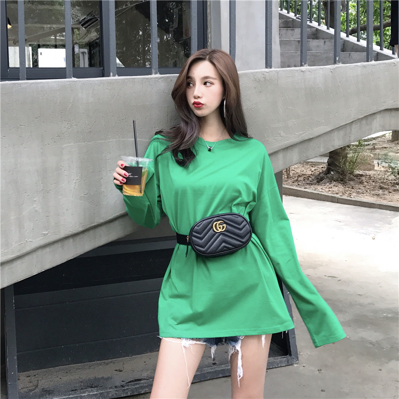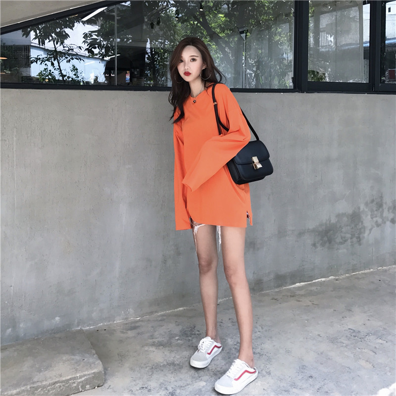 韓版新款上衣女復古長袖秋冬chic學生百搭寬松純色圓領中長款T恤