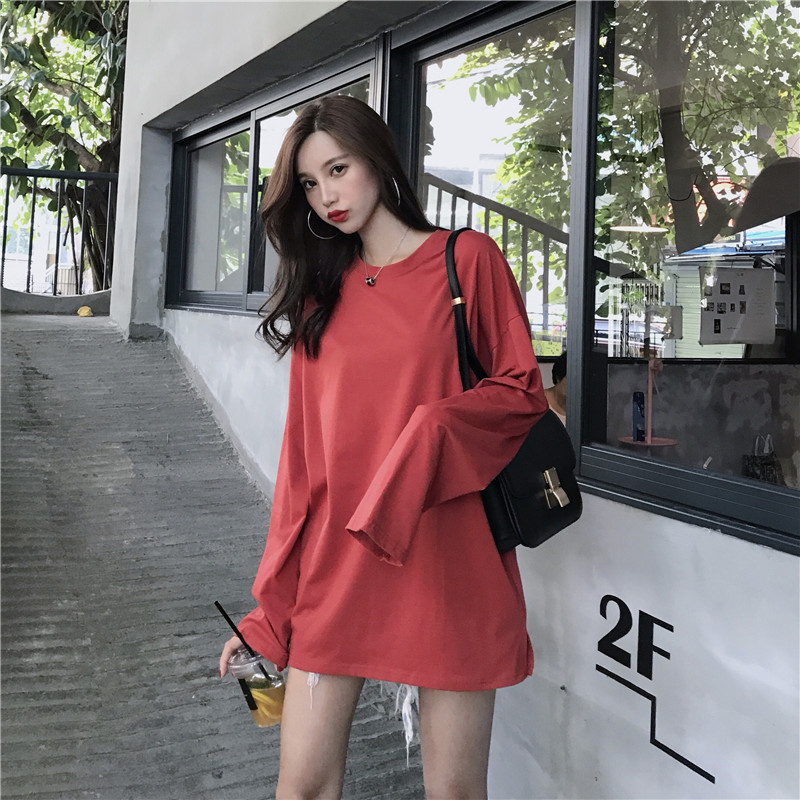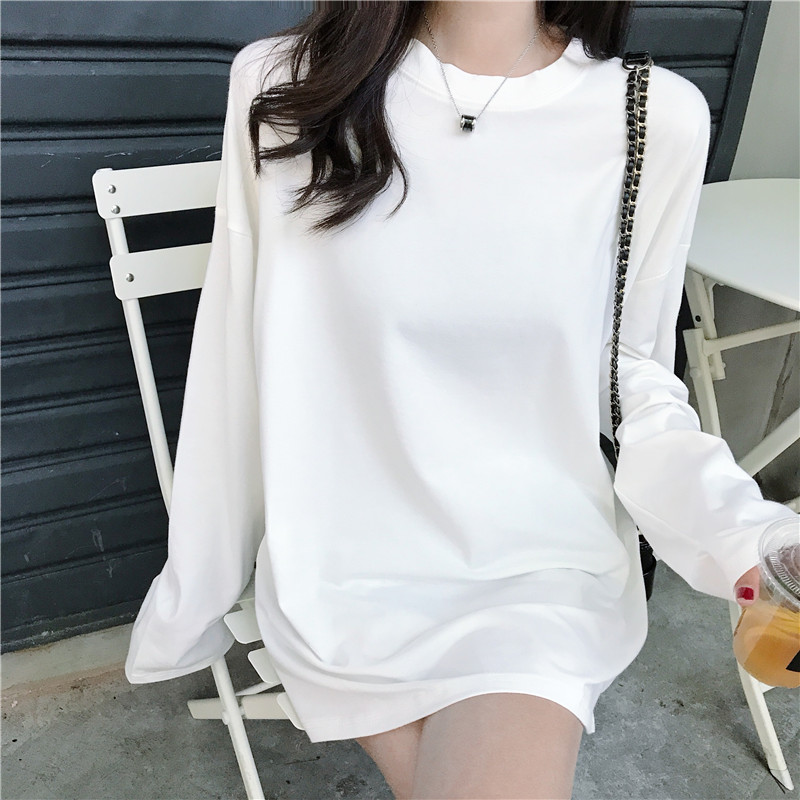 / 韓版新款上衣女復古長袖秋冬chic學生百搭寬松純色圓領中長款T恤