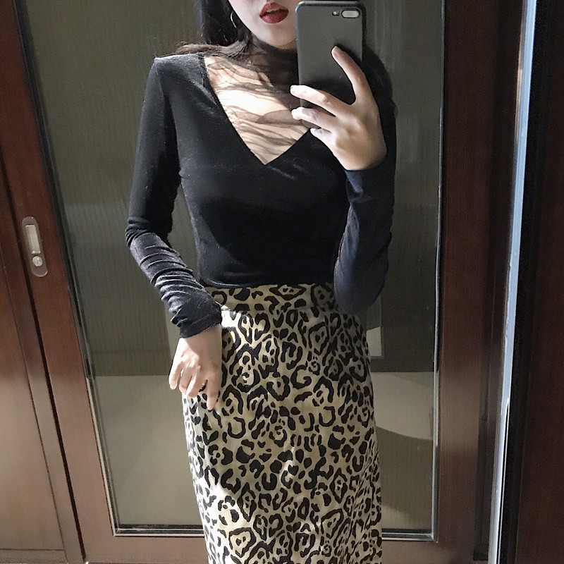 / 秋冬新款韓版上衣女裝修身顯瘦打底長袖設計感V領網紗拼接絲絨T恤