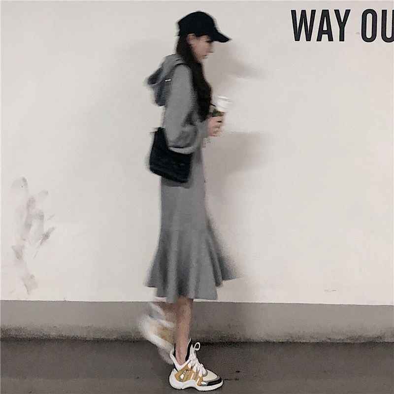 chic早秋裙子長裙女慵懶風韓版百搭寬松連帽系帶過膝長袖連衣裙潮