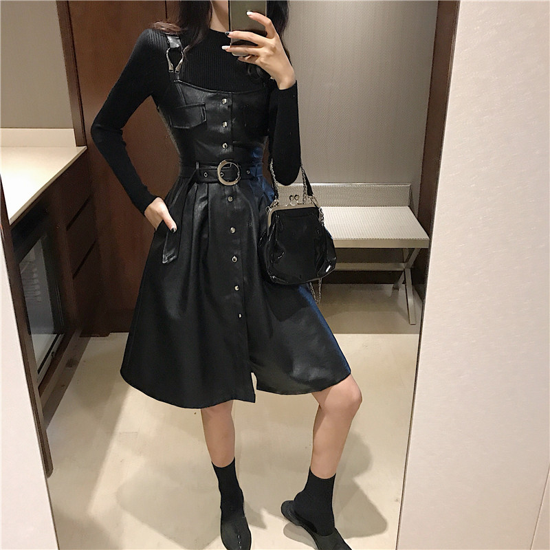 女神套裝秋冬新款半高領修身打底衫+單排扣PU皮背帶裙時尚兩件套