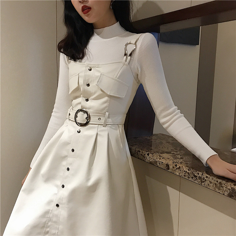 / 女神套裝秋冬新款半高領修身打底衫+單排扣PU皮背帶裙時尚兩件套