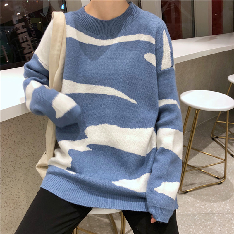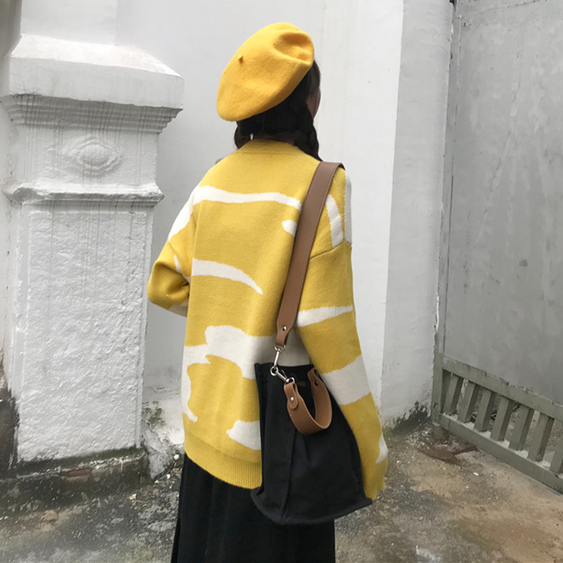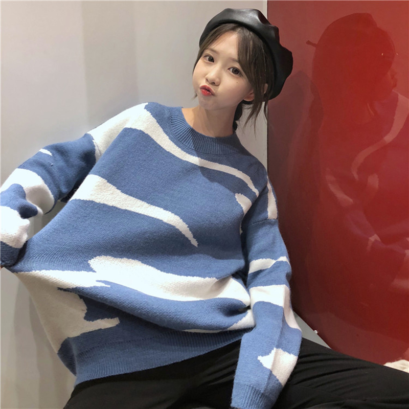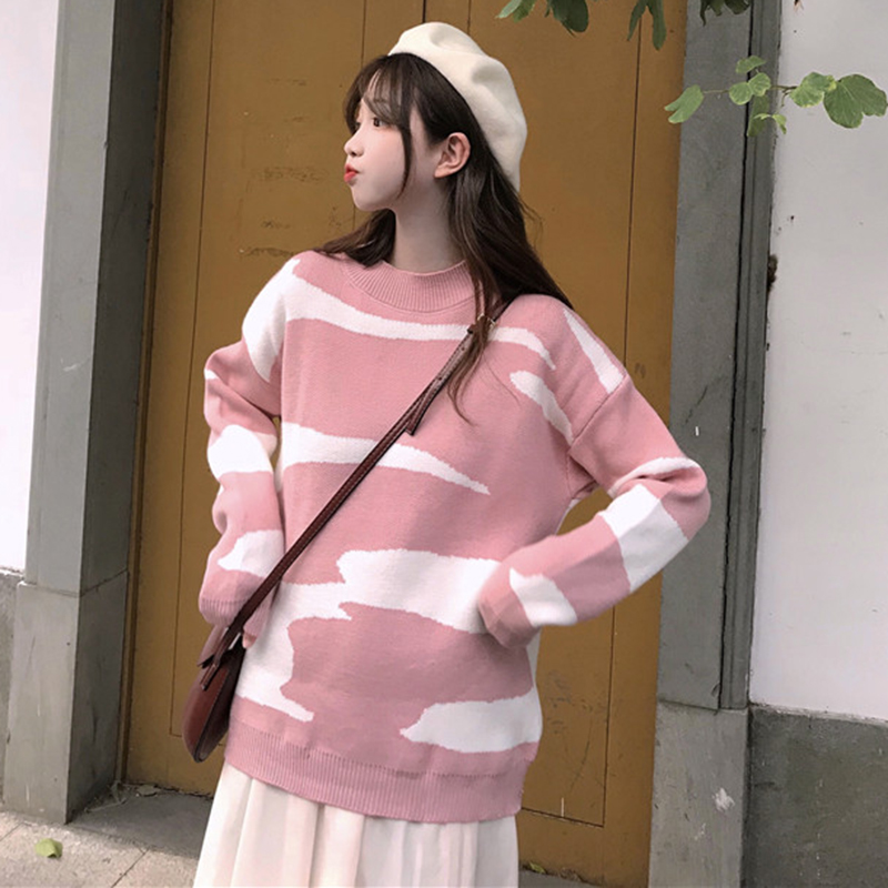 chic圓領套頭針織衫毛衣女秋裝2018新款韓版寬松撞色長袖外套上衣