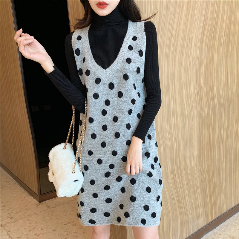 新款百搭復古v領中長款毛衣馬甲背心裙時尚套裝高領打底衫兩件套