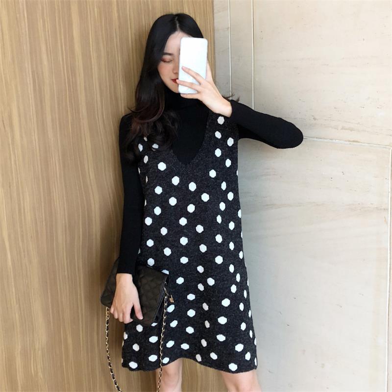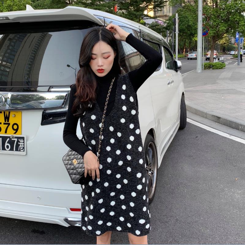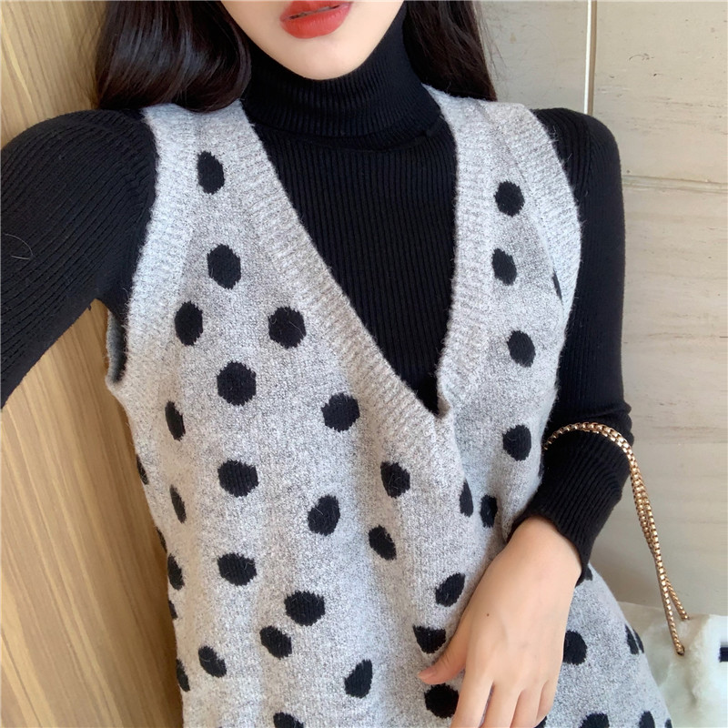 / 新款百搭復古v領中長款毛衣馬甲背心裙時尚套裝高領打底衫兩件套