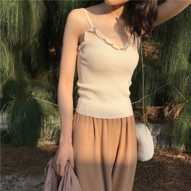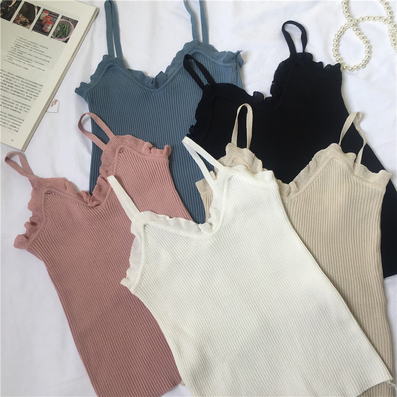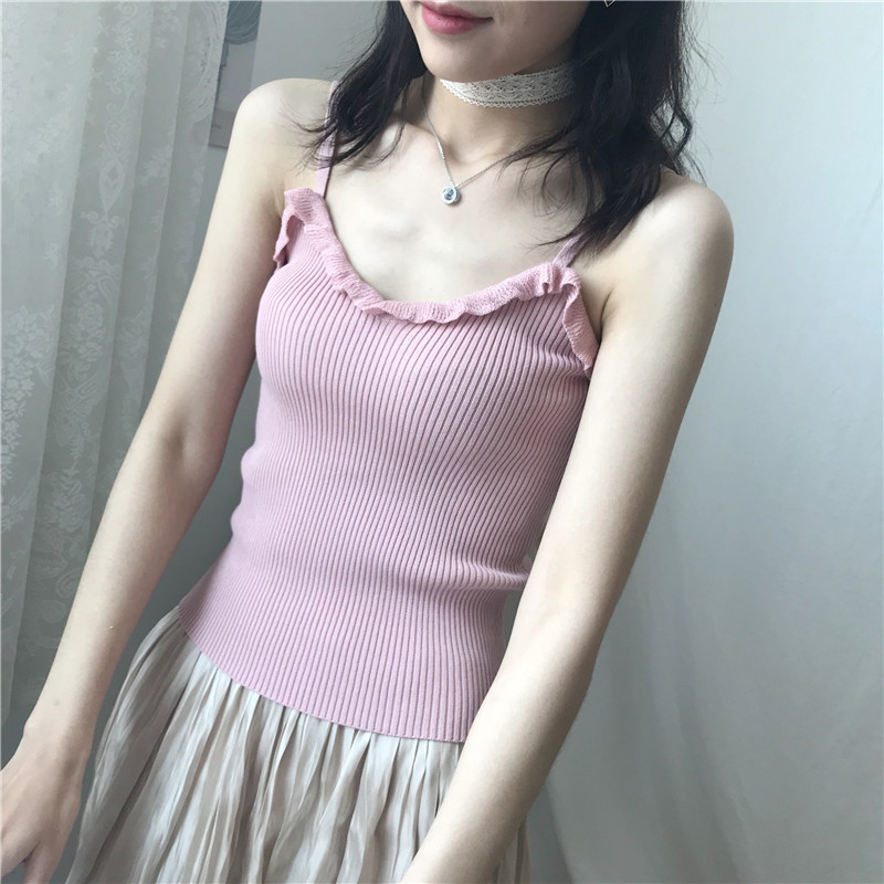 / 夏季新款女裝小花邊學生短款修身顯瘦百搭打底針織吊帶外穿小背心