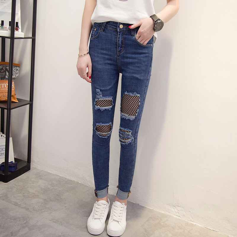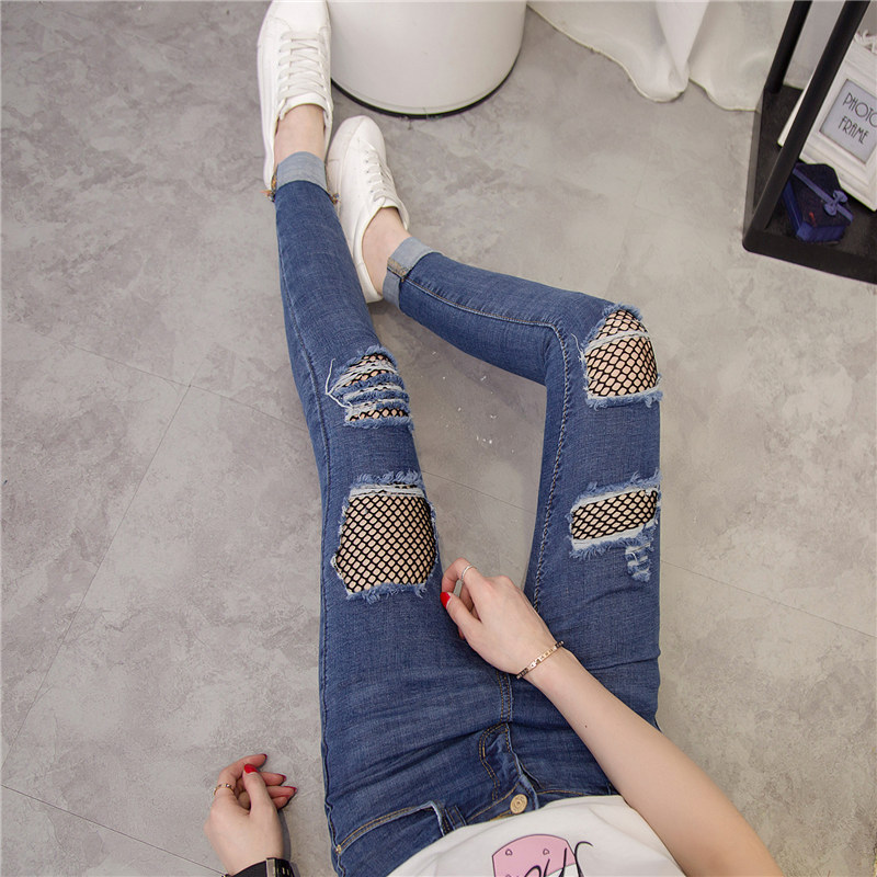 / 漁網破洞牛仔褲女春季女裝新款潮修身韓版顯瘦前部小腳褲長褲