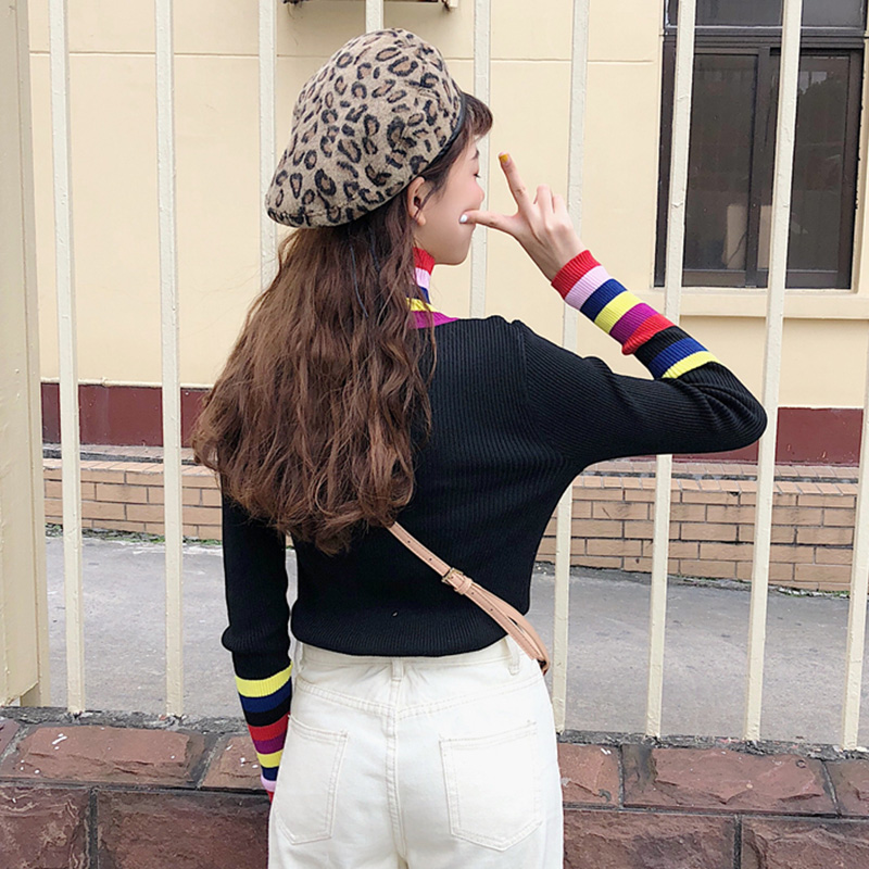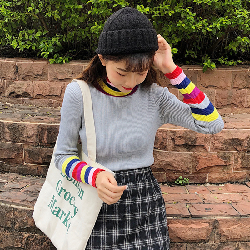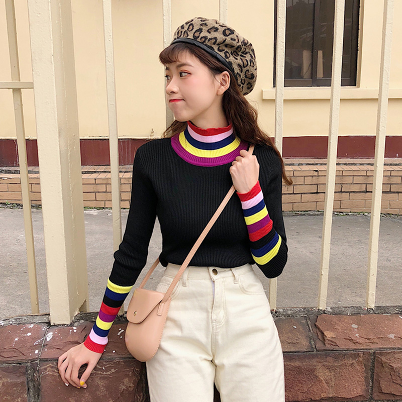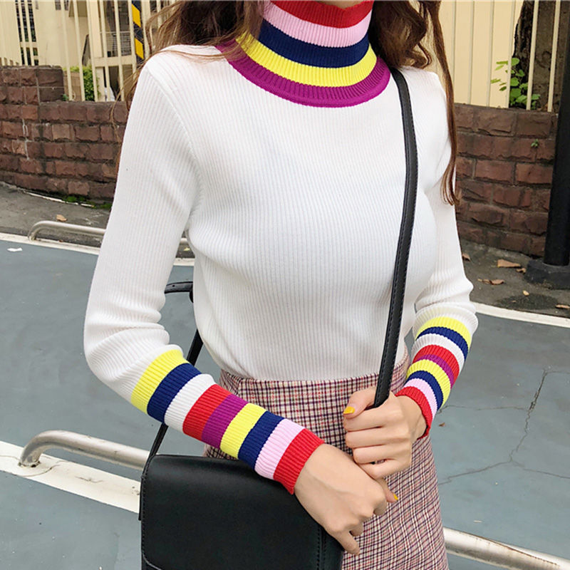 / 針織衫女秋冬裝2018新款彩虹條紋長袖高領上衣修身顯瘦打底T恤潮