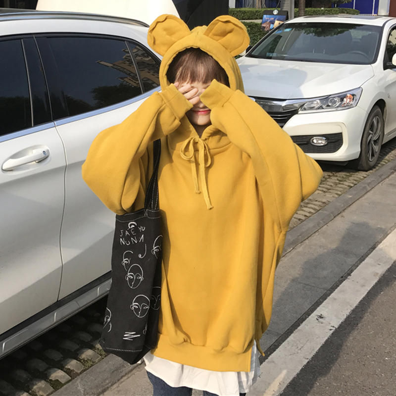 / 可愛熊耳朵加絨連帽衛衣秋冬女裝新款開叉假兩件外套寬松長袖上衣