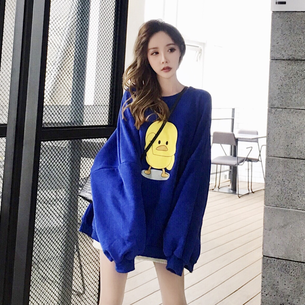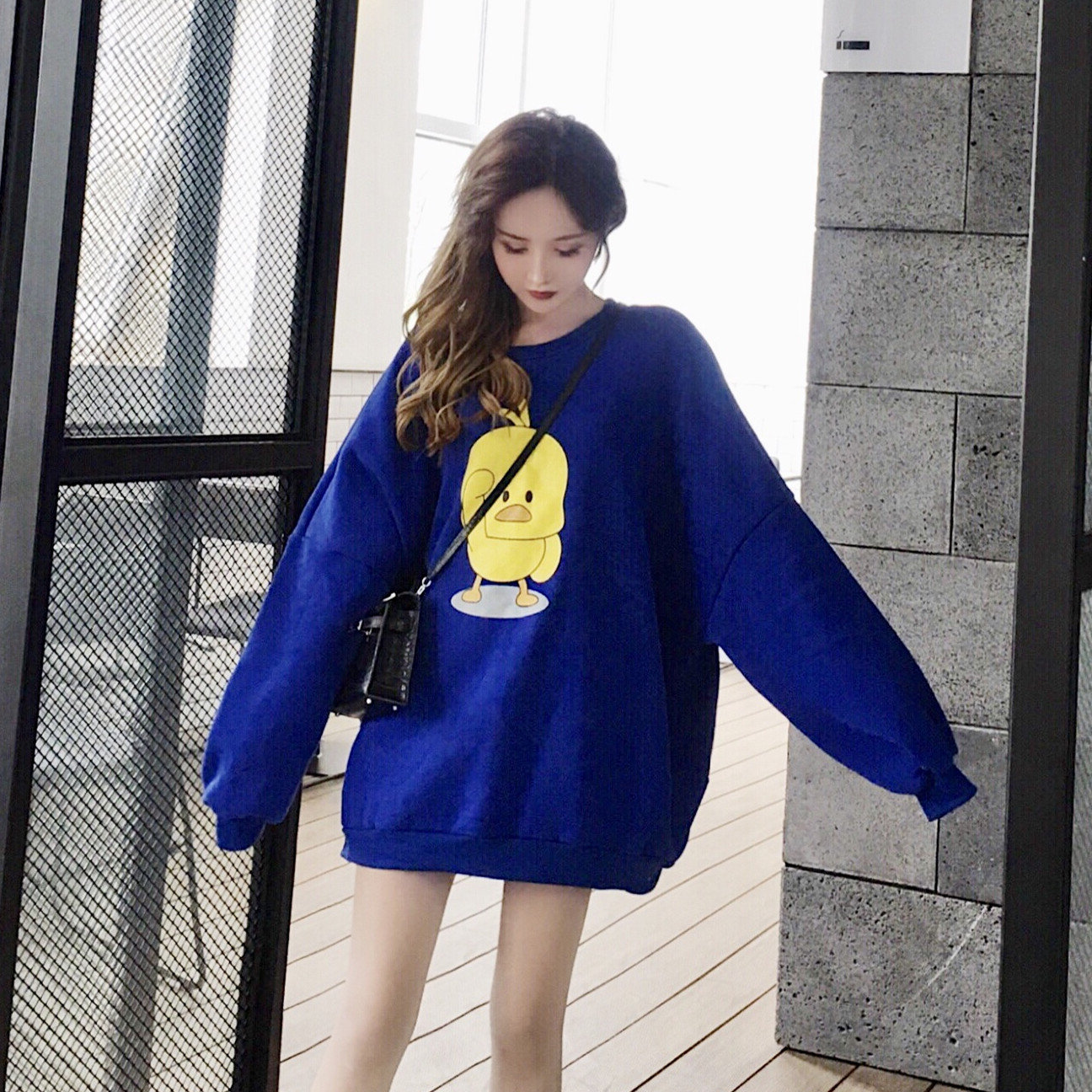 / chic秋冬上衣慵懶衛衣女秋圓領加絨加厚中長款寬松套頭網紅小黃鴨