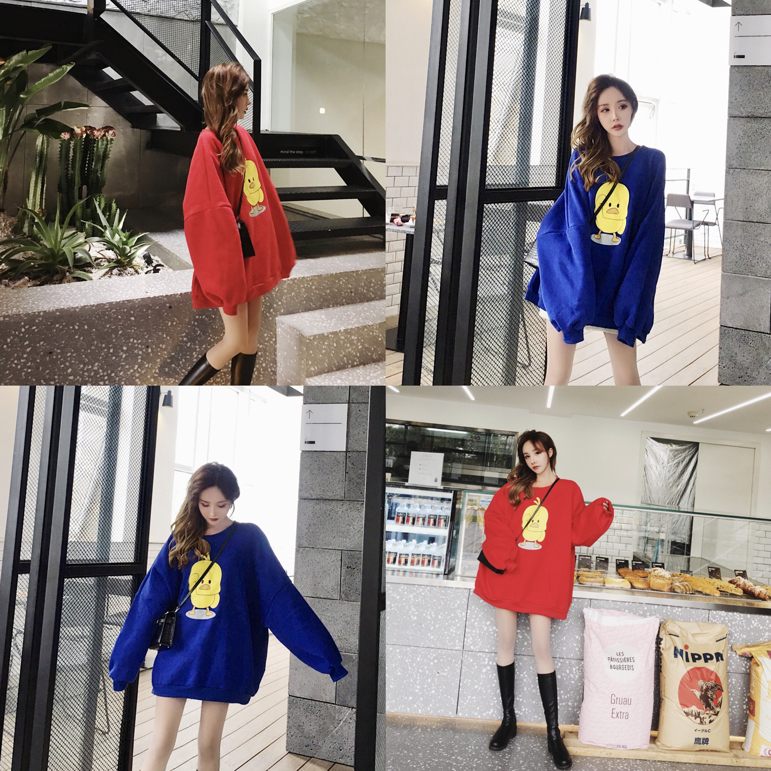 chic秋冬上衣慵懶衛衣女秋圓領加絨加厚中長款寬松套頭網紅小黃鴨