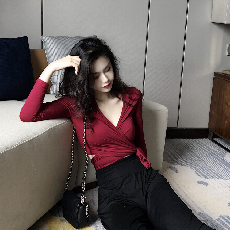 / 2018新款性感V領系帶打結T恤短款開衫+韓版百搭高腰闊腿褲分開拍