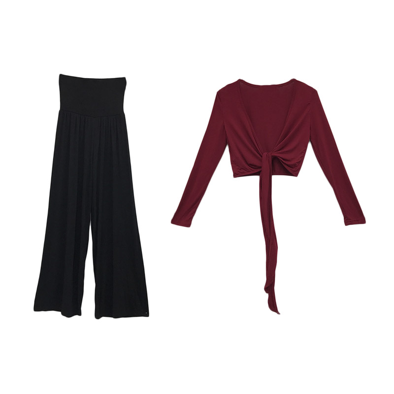 酒紅色綁帶T|黑色綁帶T|黑色褲子|灰色褲子