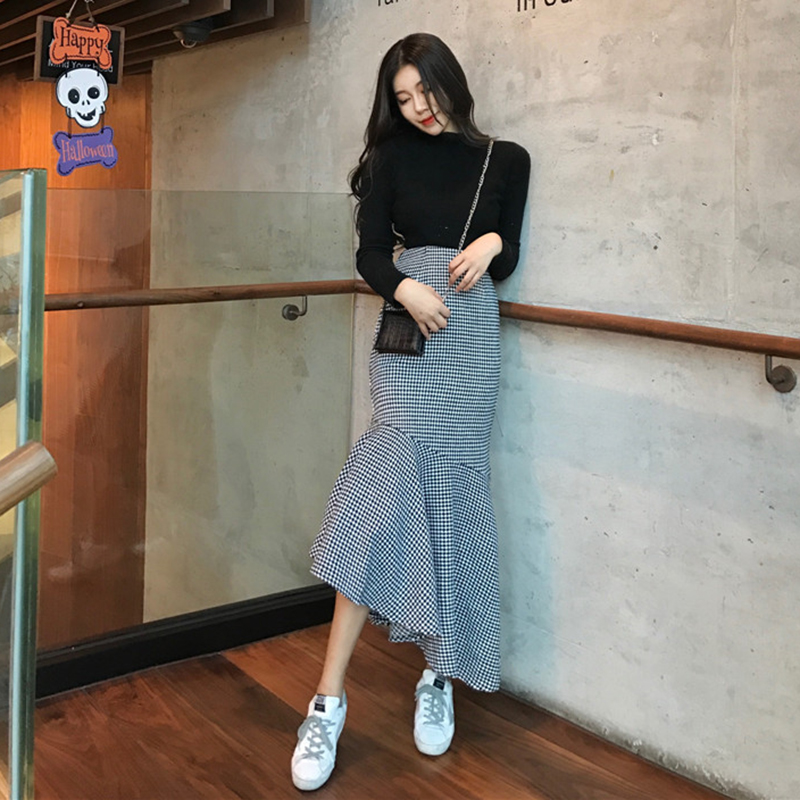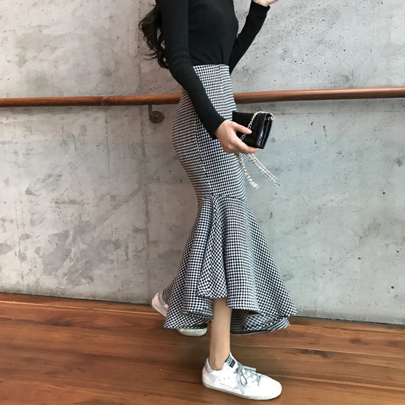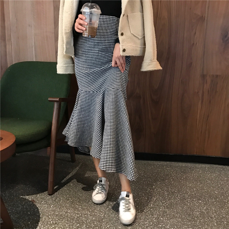 chic風毛呢格子半身裙女秋冬裝2018新款韓版氣質高腰包臀魚尾裙子