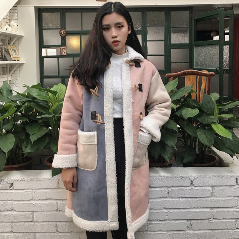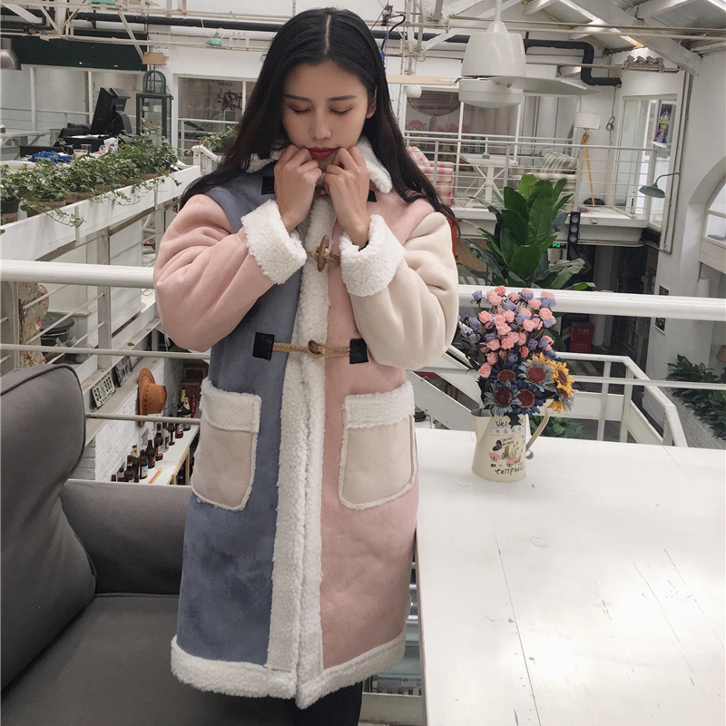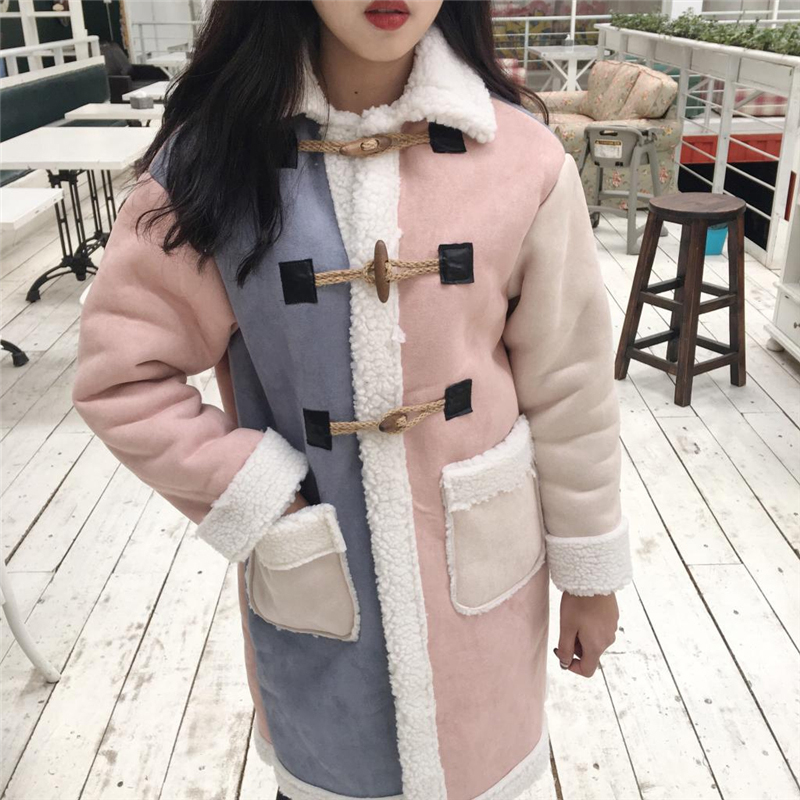 羊羔毛拼接撞色棉衣2018冬季女裝新款寬松顯瘦棉襖加厚保暖外套潮