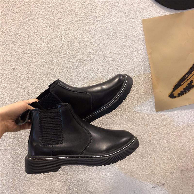 / 秋季2018新款黑色靴子圓頭PU氣質時尚復古百搭松緊帶平跟女鞋子潮