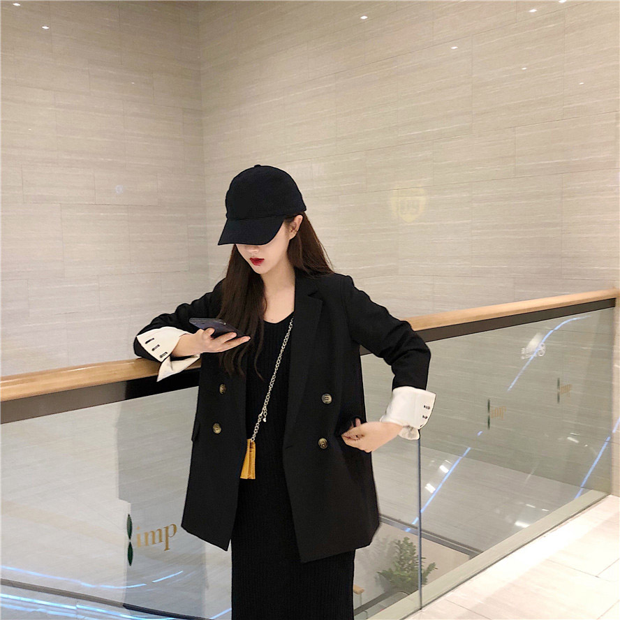 西裝套裝女chic外套寬松港風復古小西服V領針織吊帶連衣裙兩件套