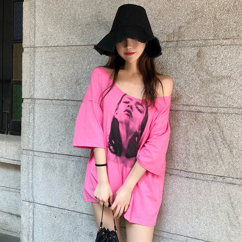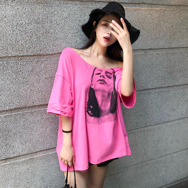T恤女夏新款韓版女裝寬松中長款短袖體恤百搭人物印花休閑圓領TEE
