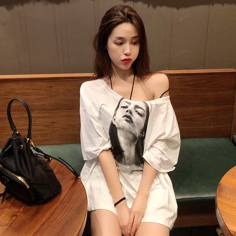 / T恤女夏新款韓版女裝寬松中長款短袖體恤百搭人物印花休閑圓領TEE