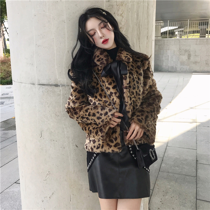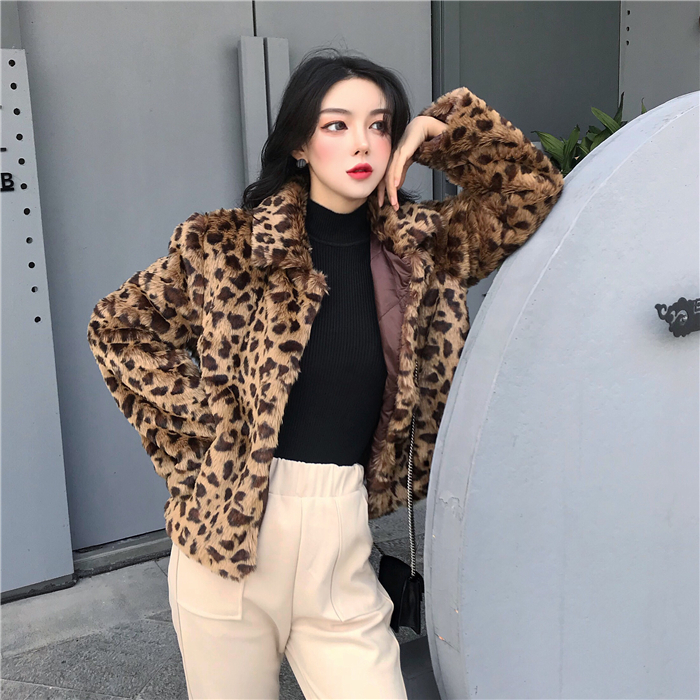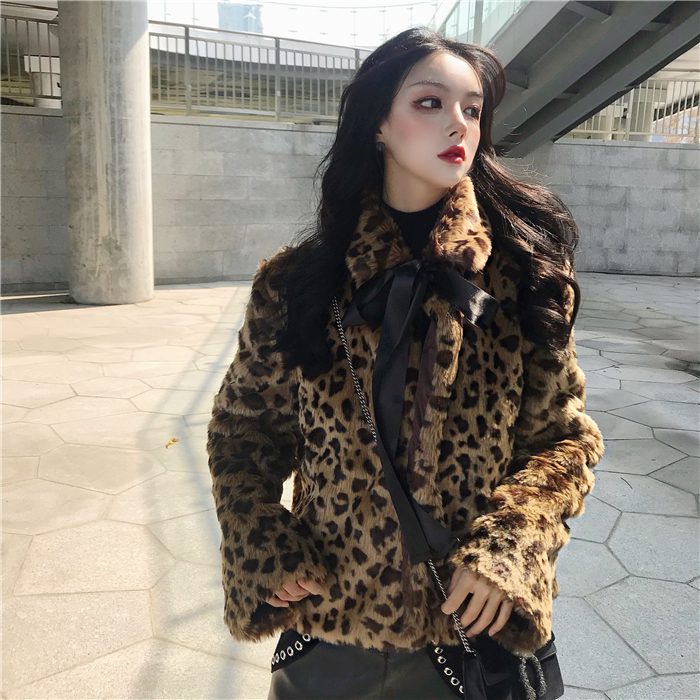 網紅同款外套女秋冬2018新款韓版百搭加厚豹紋毛絨外套女~配絲帶