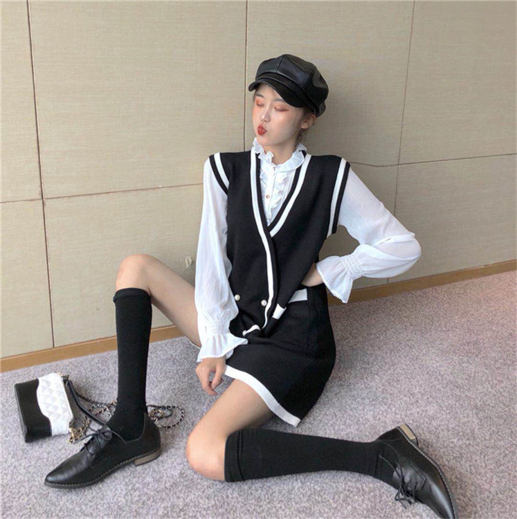 / 韓版名媛小香風時尚套裝秋季新款毛線裙襯衣套裝毛衣背心裙兩件套