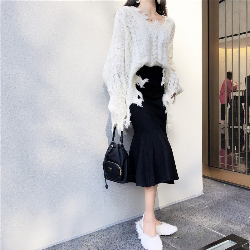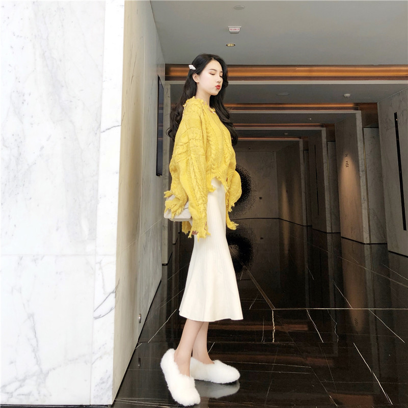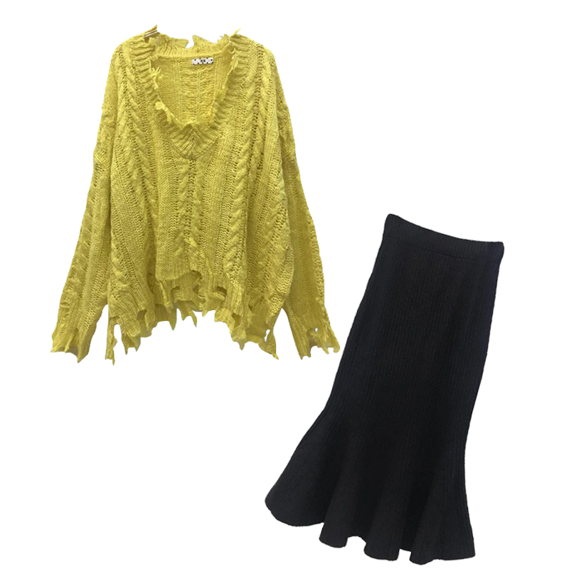 黃色毛衣|白色毛衣|黑色魚尾裙|杏色魚尾裙
