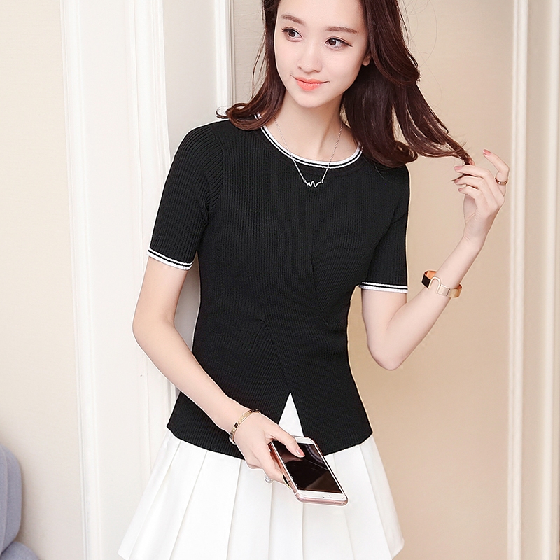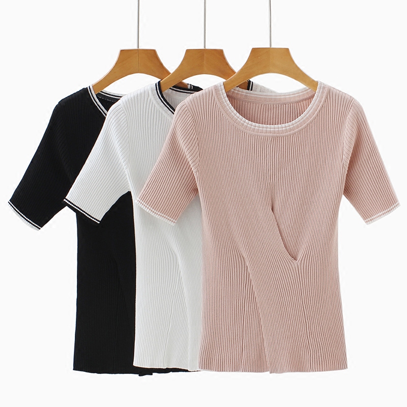 / 宜朵白色針織短袖女夏短款韓版修身百搭冰絲t恤上衣女薄款打底衫