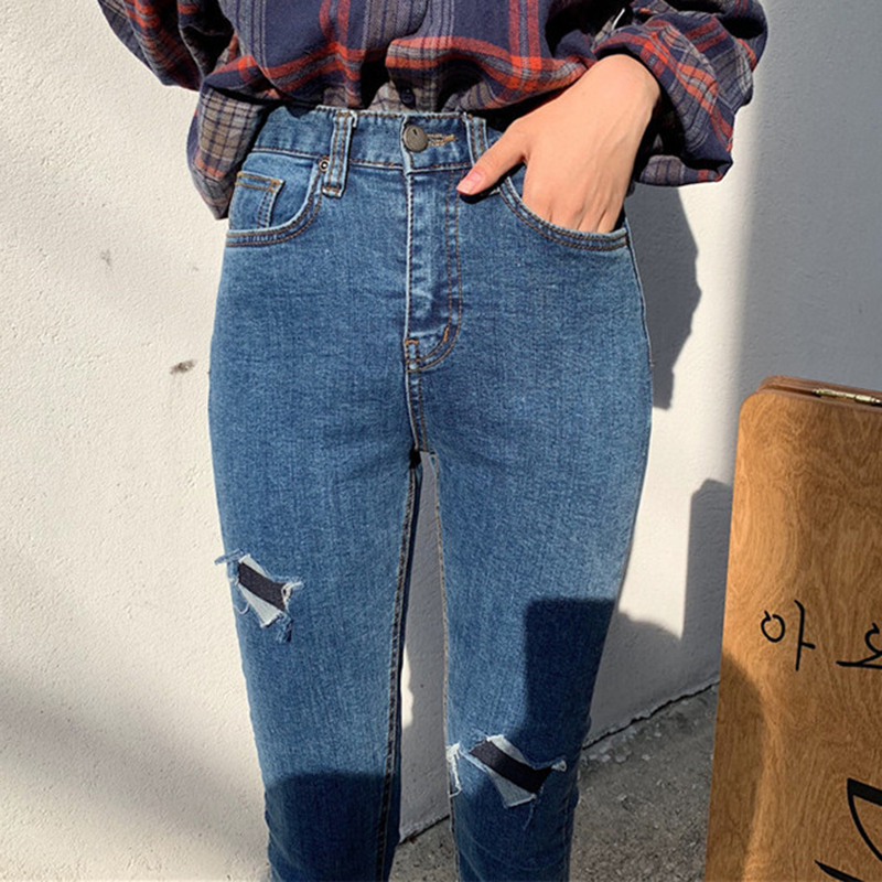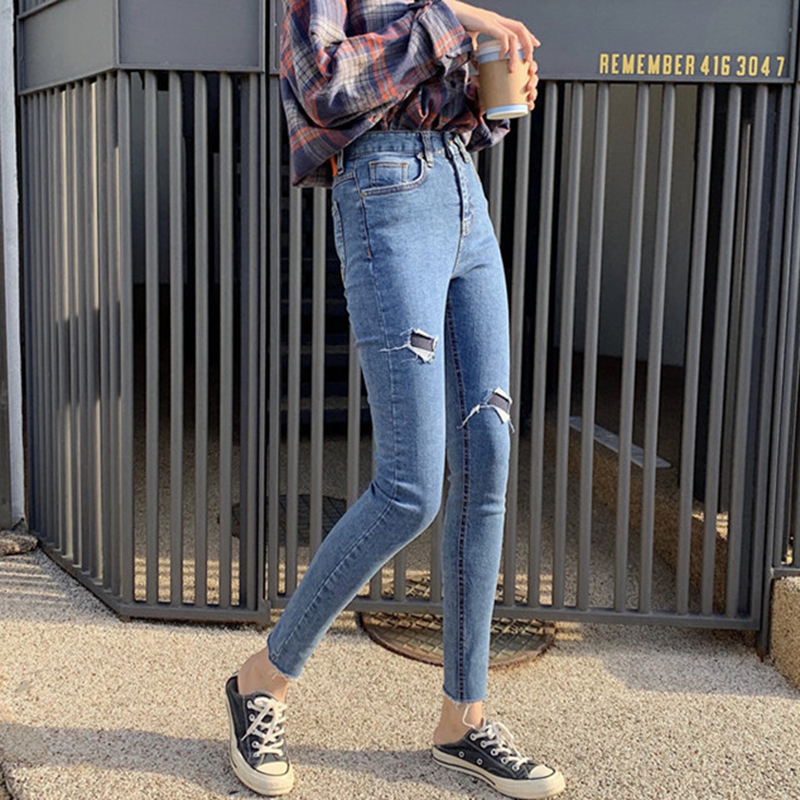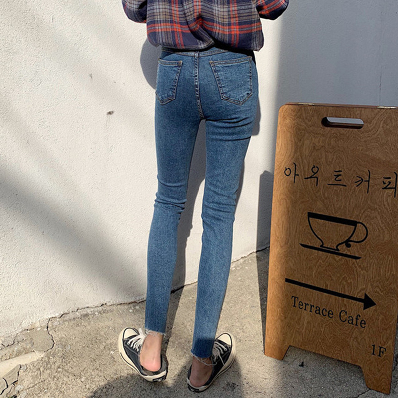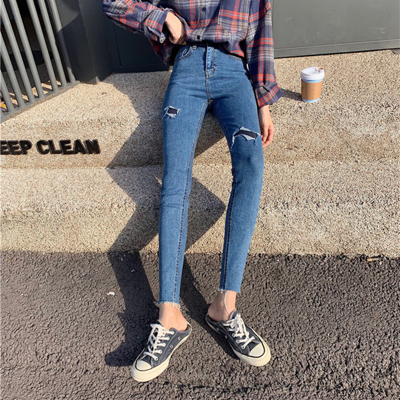 / 高腰顯瘦假破洞緊身牛仔褲女秋冬裝新款學生復古須邊九分鉛筆褲子
