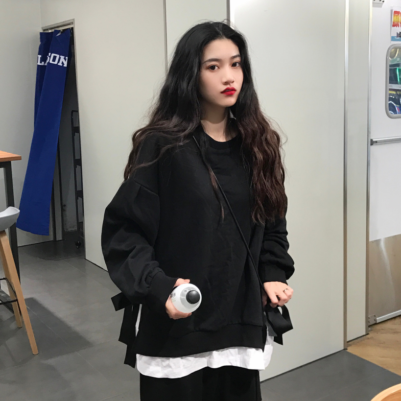 早秋衛衣2018新款女長袖韓版寬松百搭假兩件系帶顯瘦套頭衛衣上衣