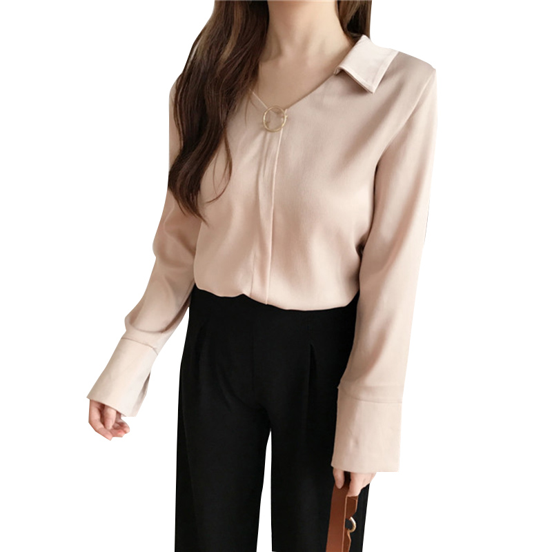初秋新款韓版女裝港味復古氣質V領長袖雪紡襯衫少女純色百搭上衣