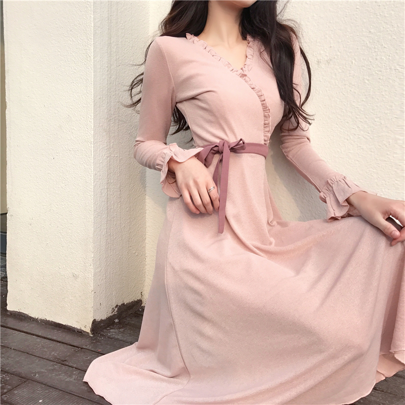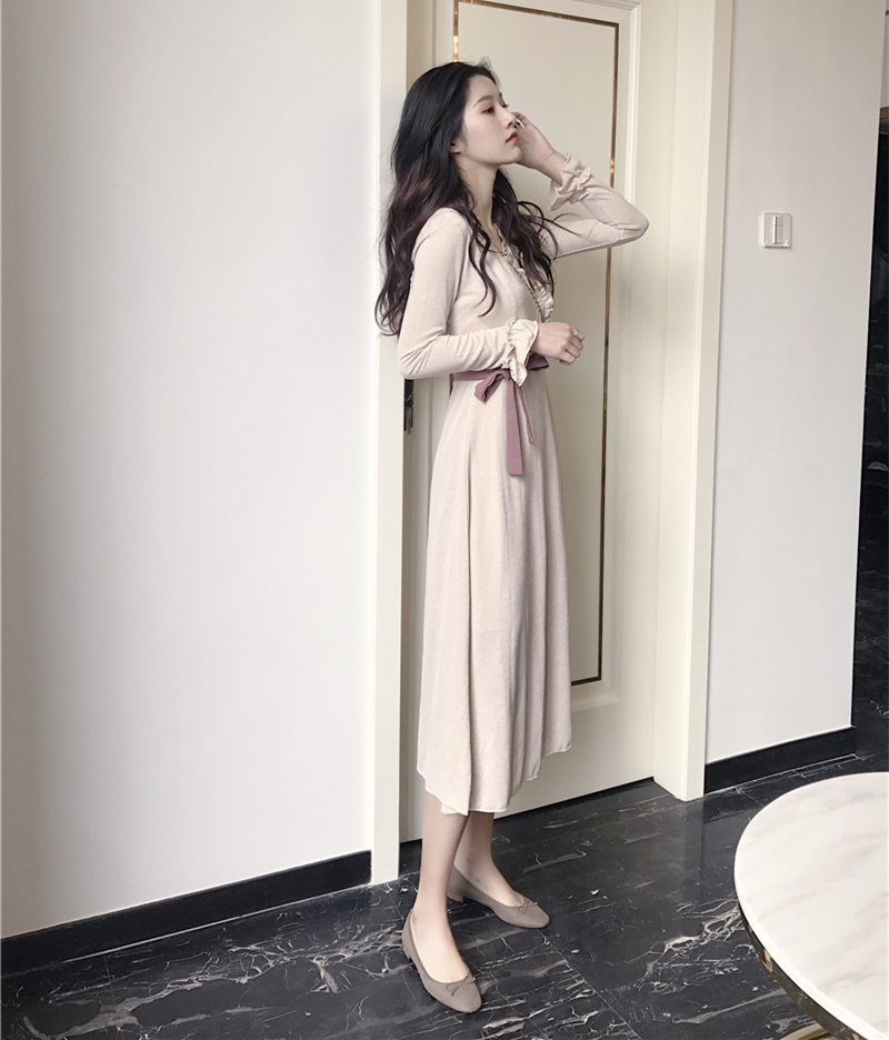 / 晚晚風新款韓版百搭中長款森女系時尚小清新chic花邊系帶連衣裙潮