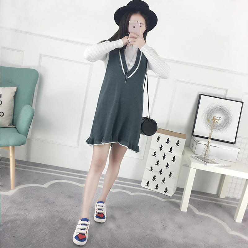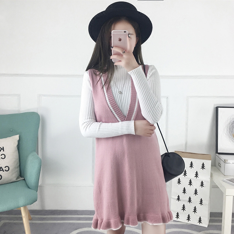 / 中長款韓版毛衣裙女背帶裙背心吊帶裙荷葉邊無袖寬松秋冬連衣裙潮