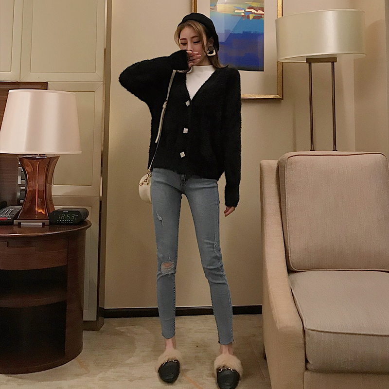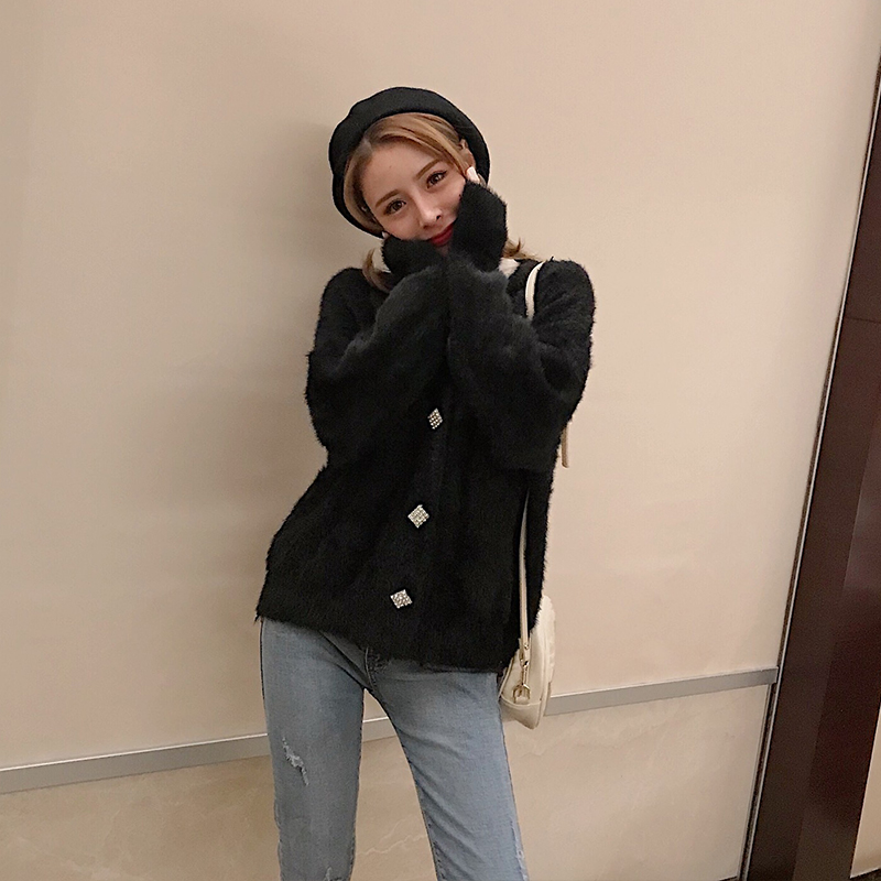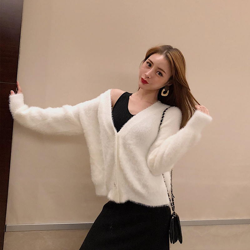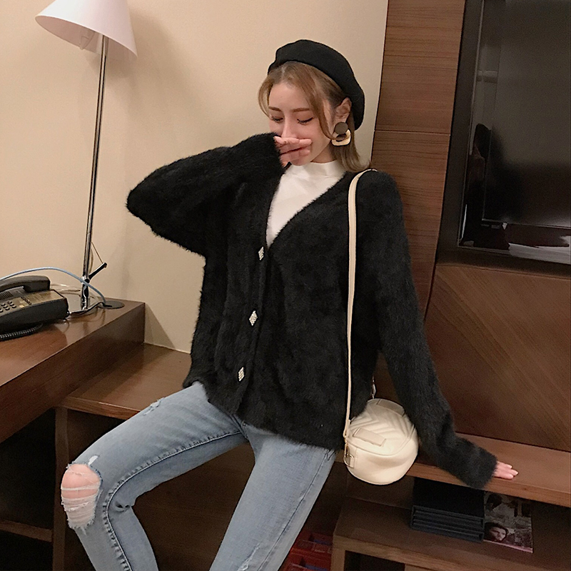 / 秋冬新款韓版百搭寬松V領時尚開衫甜美毛毛外套保暖加厚chic毛衣
