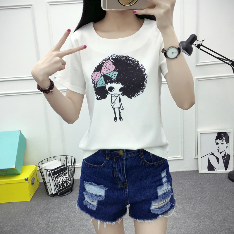 夏季新款雪紡印花短袖T恤雪紡衫女韓版寬松大碼百搭學生上衣