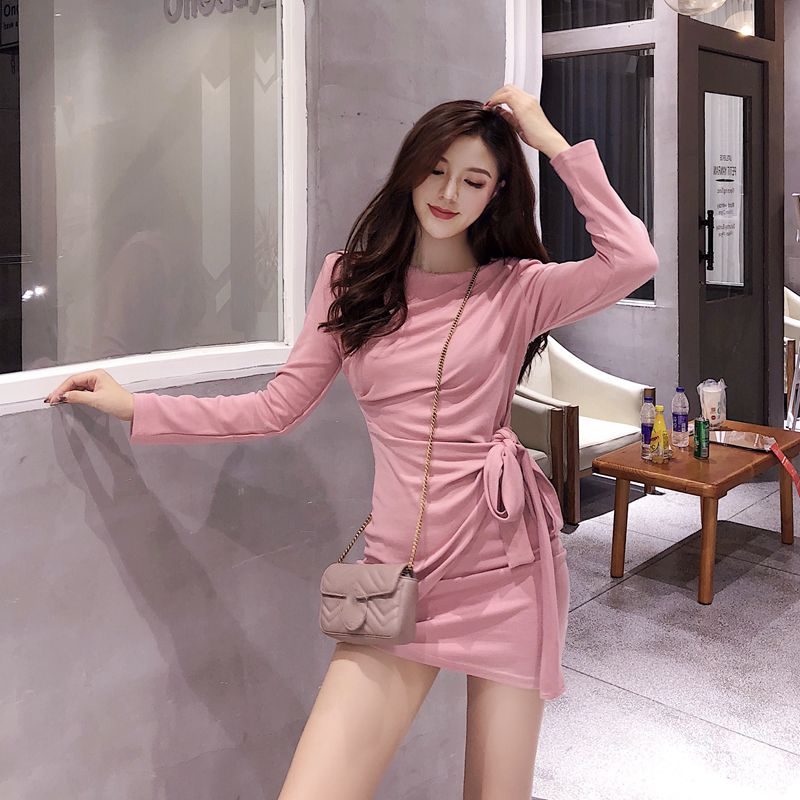 女秋裝2018新款裙子韓版氣質百搭修身顯瘦不規則綁帶露肩連衣裙潮