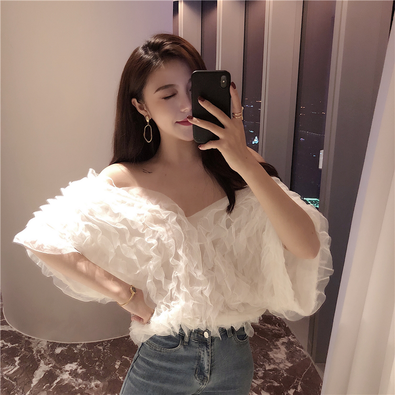 / 夏季女裝新款氣質波浪花邊V領露肩短袖上衣百搭時尚微透雪紡衫女