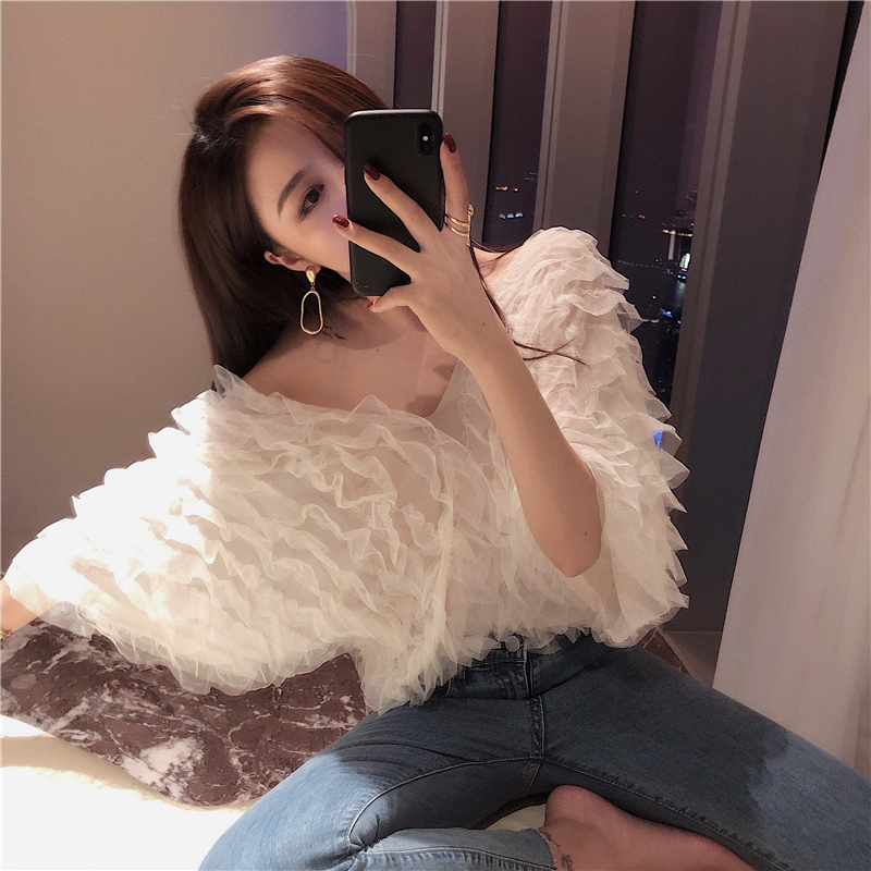 夏季女裝新款氣質波浪花邊V領露肩短袖上衣百搭時尚微透雪紡衫女
