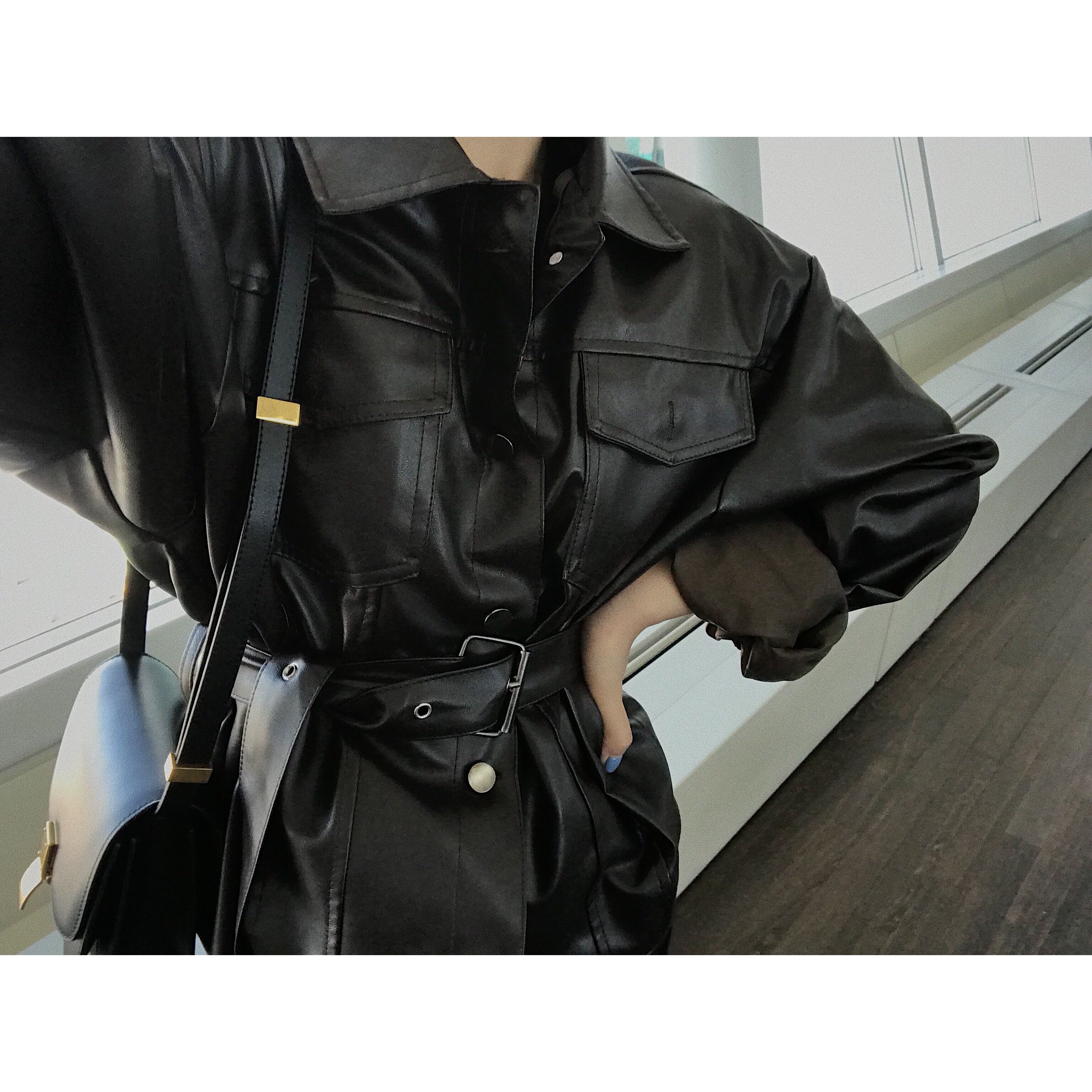 外套女春秋2018新款韓版兩種風格寬松polo領大口袋皮衣長袖外套潮