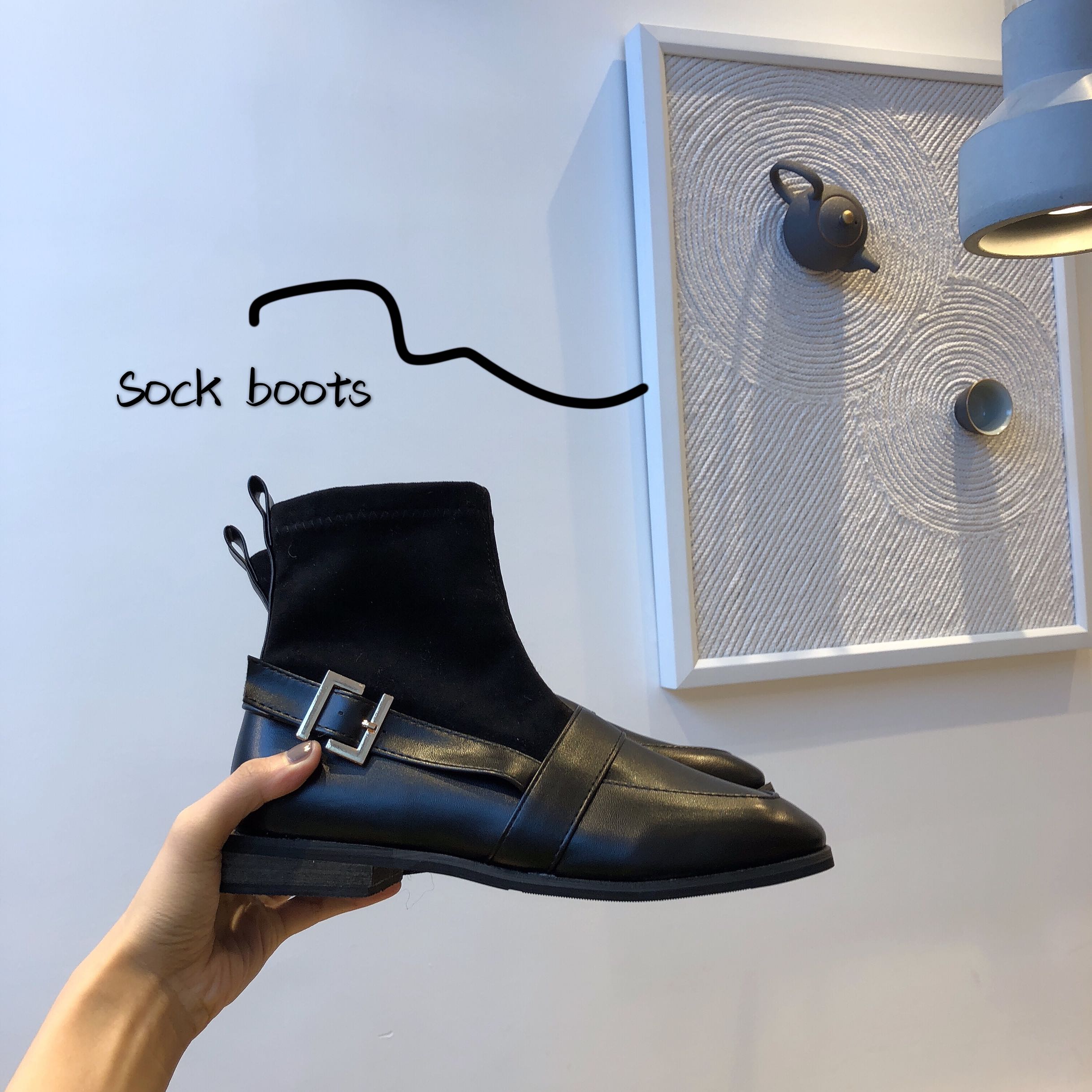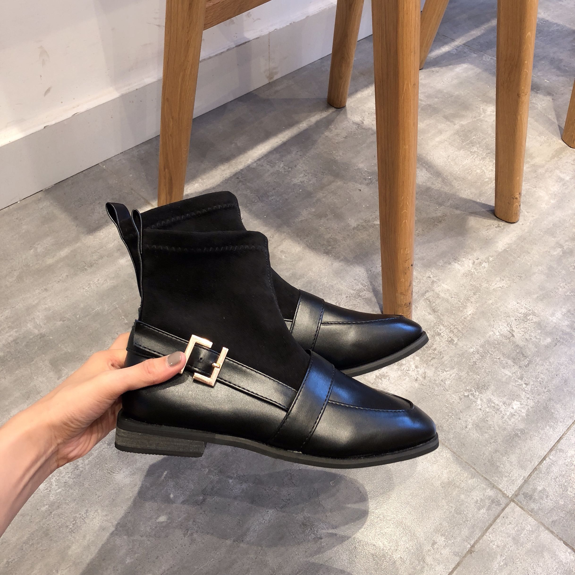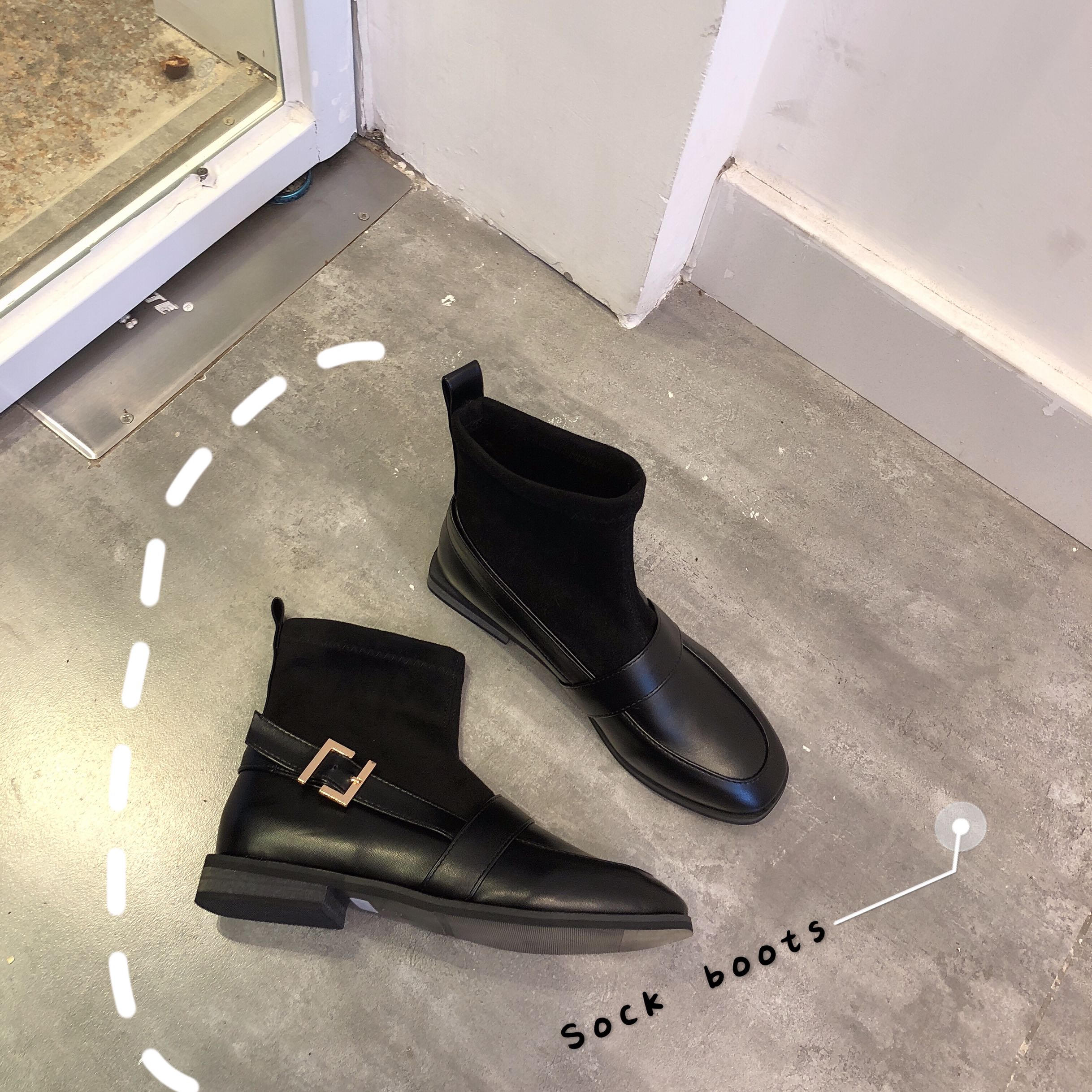 新款韓版網紅同款彈力靴時尚女鞋黑色瘦瘦靴方頭中筒皮帶扣短靴潮