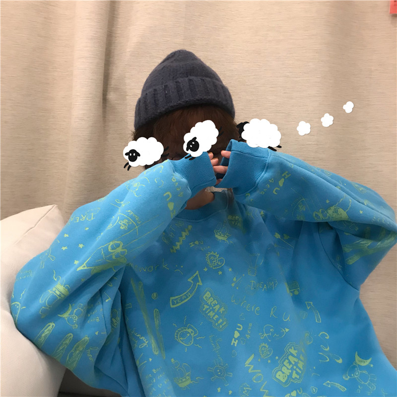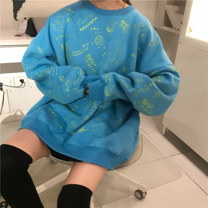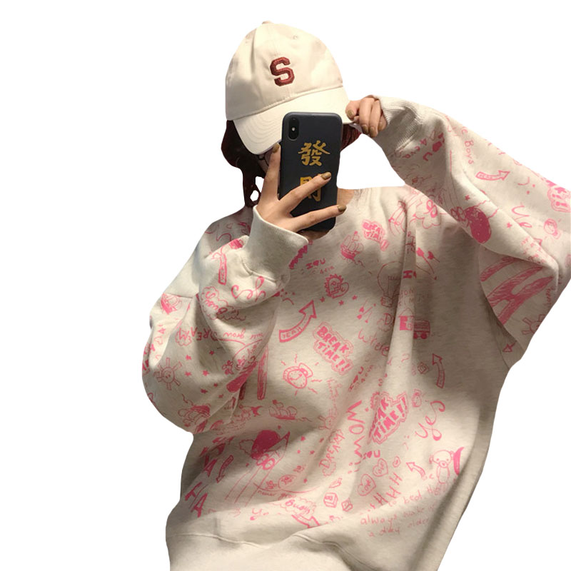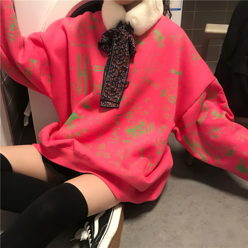 2018新款秋冬女裝韓版中長款寬松慵懶風卡通加厚加絨衛衣上衣外套