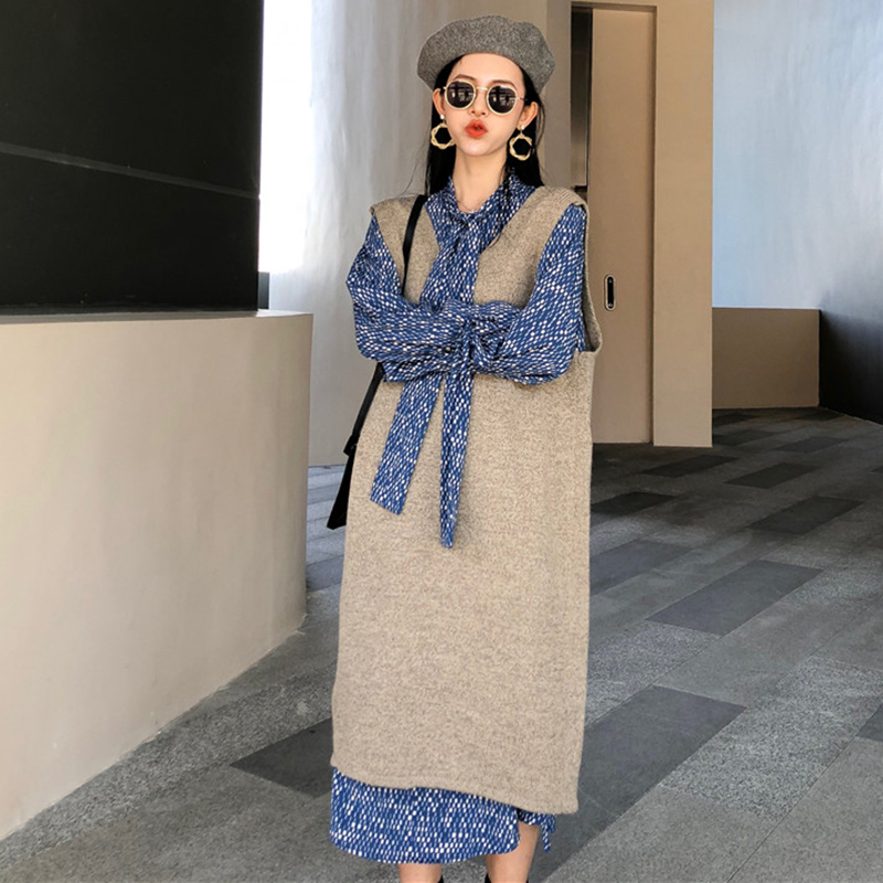 黑波點連衣裙|藍色連衣裙|針織馬甲