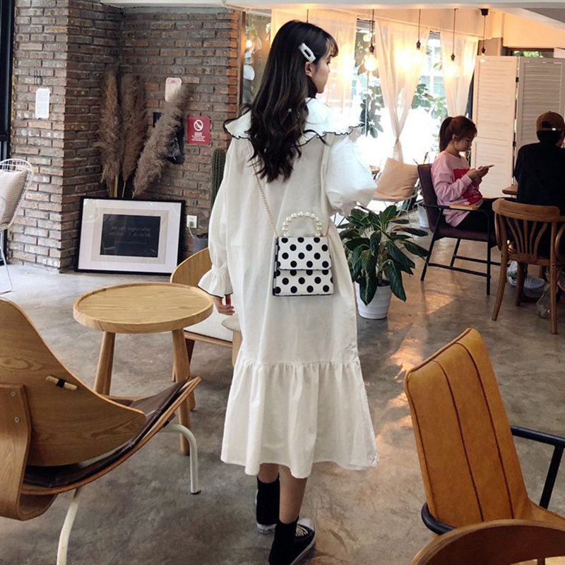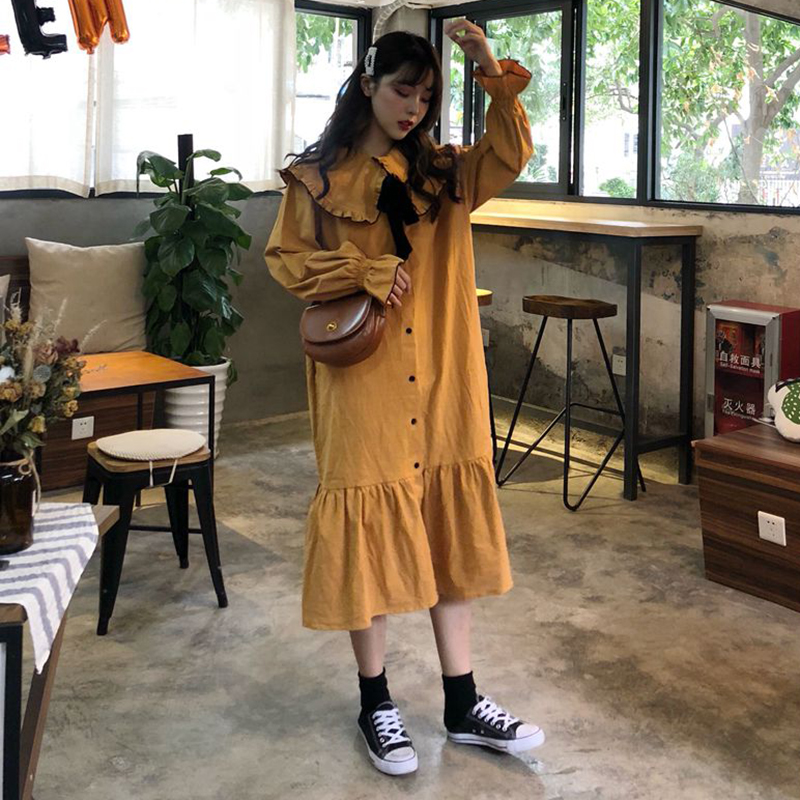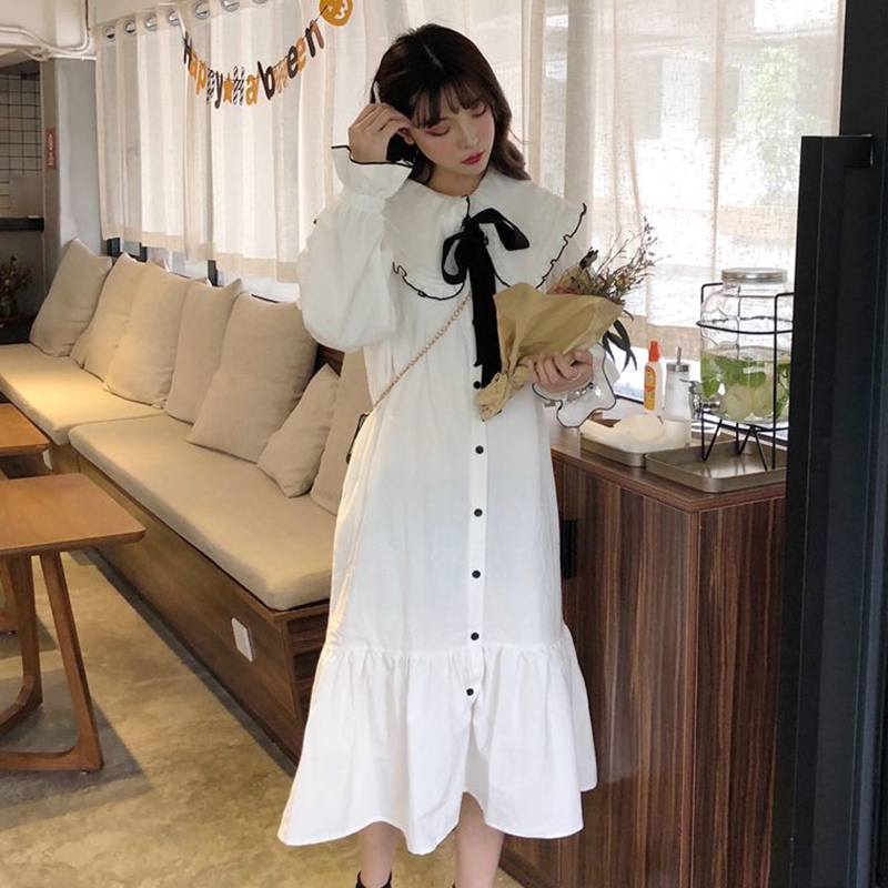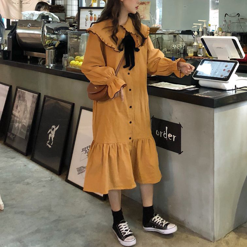 / 法式少女茶歇裙冬裝新款韓版荷葉邊拼接翻領系帶蝴蝶結eeg連衣裙