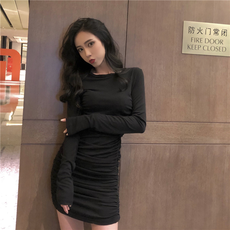 秋天港味新品chic高端大氣修身溫柔復古拉皺針織中長款純色連衣裙