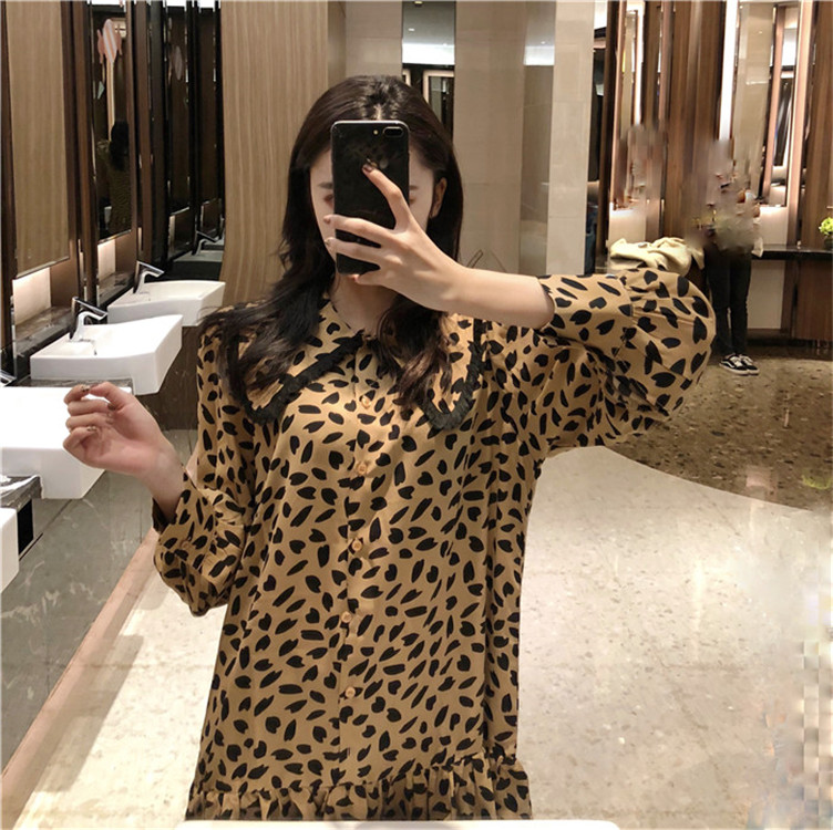 / 可可里小姐~韓版復古流蘇娃娃領豹紋收腰連衣裙+圓領套頭毛衣女