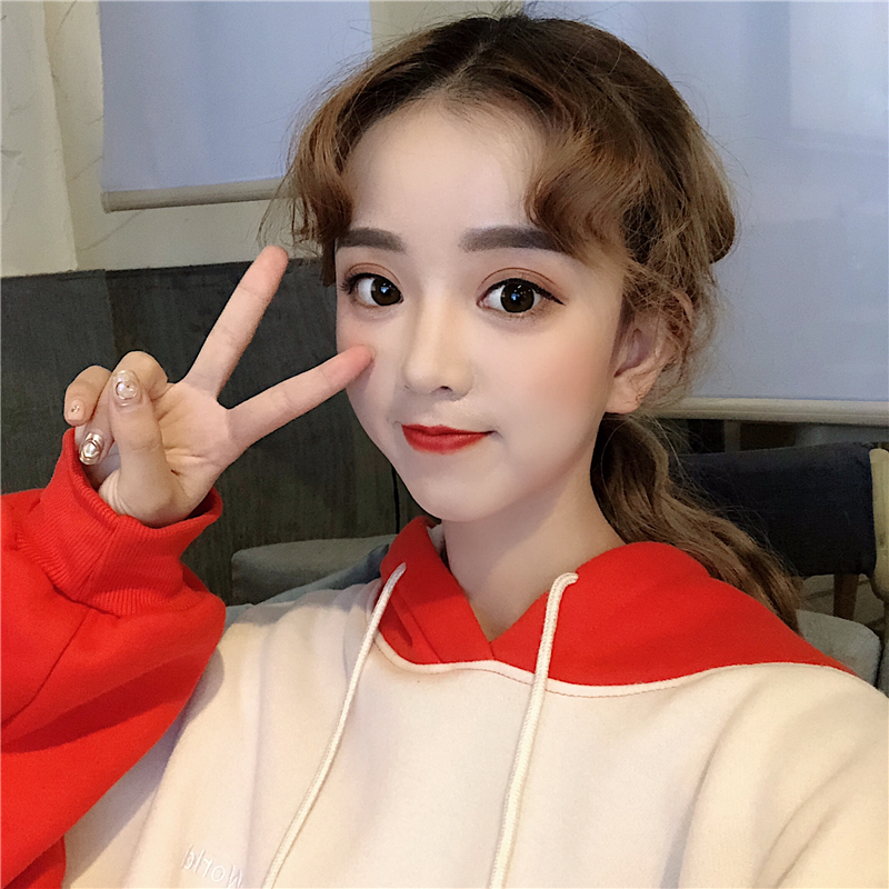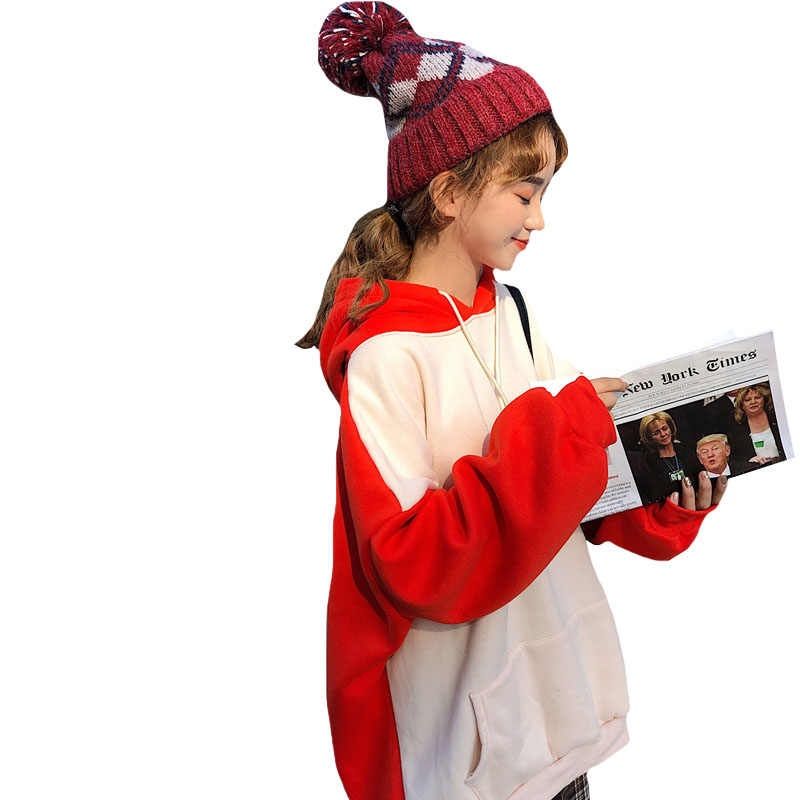 / 秋冬女裝韓版中長款慵懶風拼色寬松刺繡字母連帽套頭衛衣上衣外套