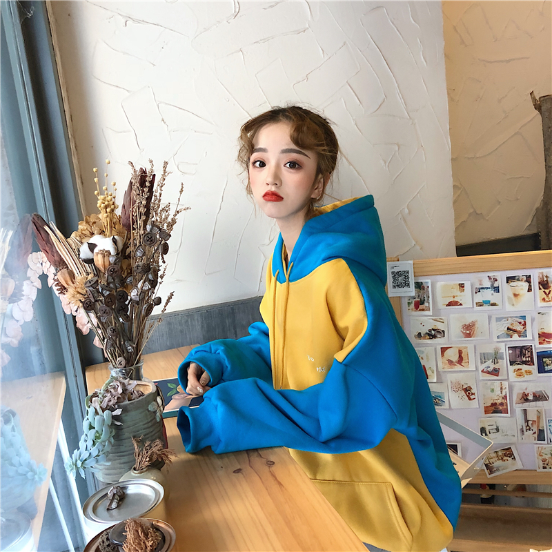 秋冬女裝韓版中長款慵懶風拼色寬松刺繡字母連帽套頭衛衣上衣外套