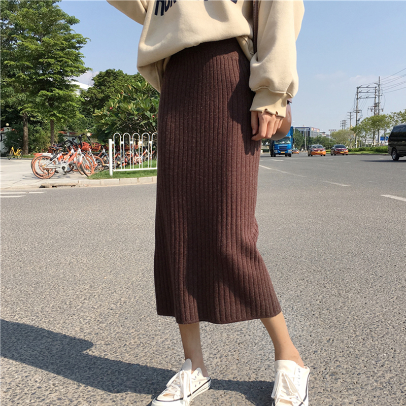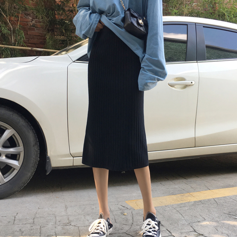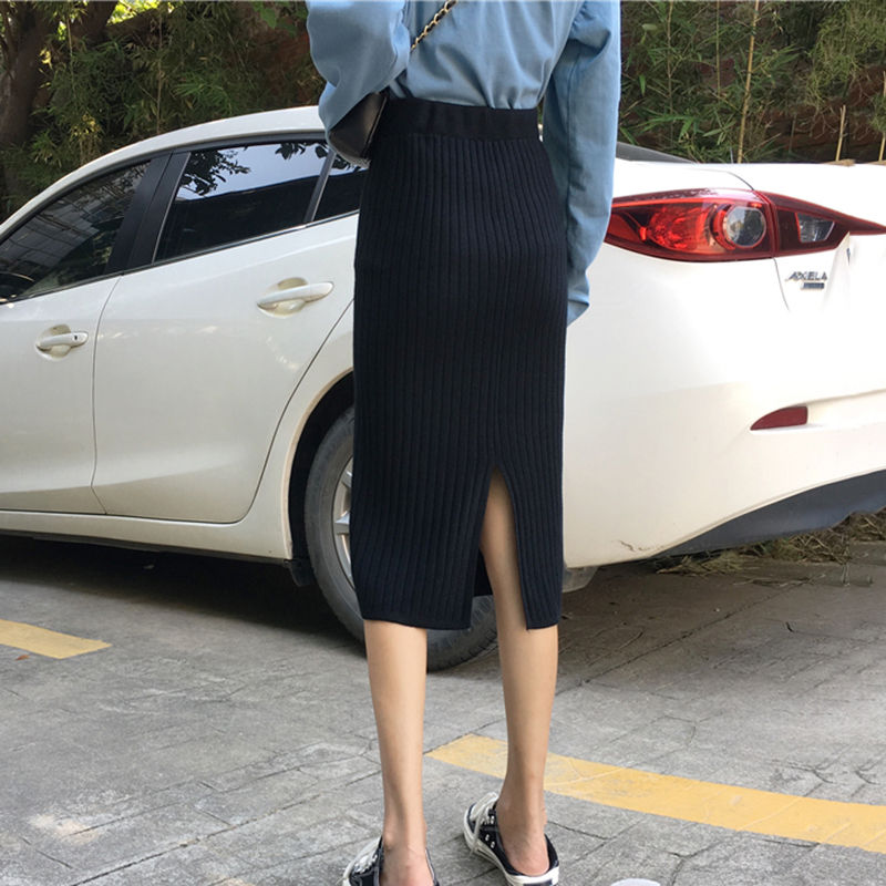 復古風針織半身裙秋裝女2018新款高腰顯瘦包臀裙純色開叉中長裙子
