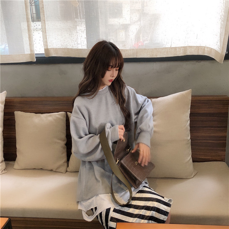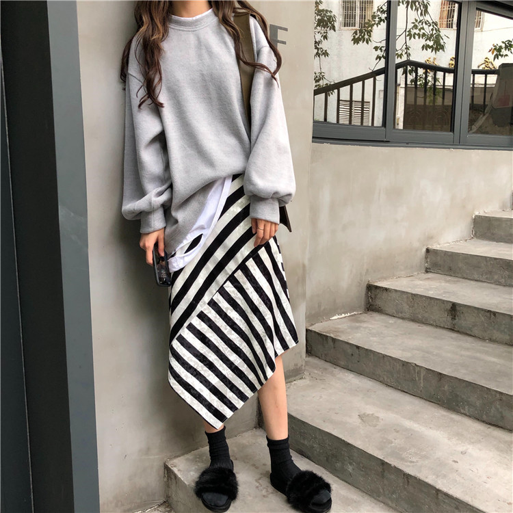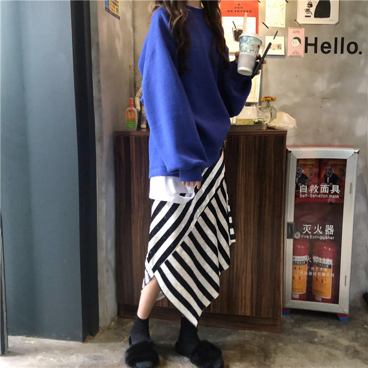 / 女神套裝秋冬新款撞色拼接坑條假兩件中長款衛衣+百搭條紋半身裙