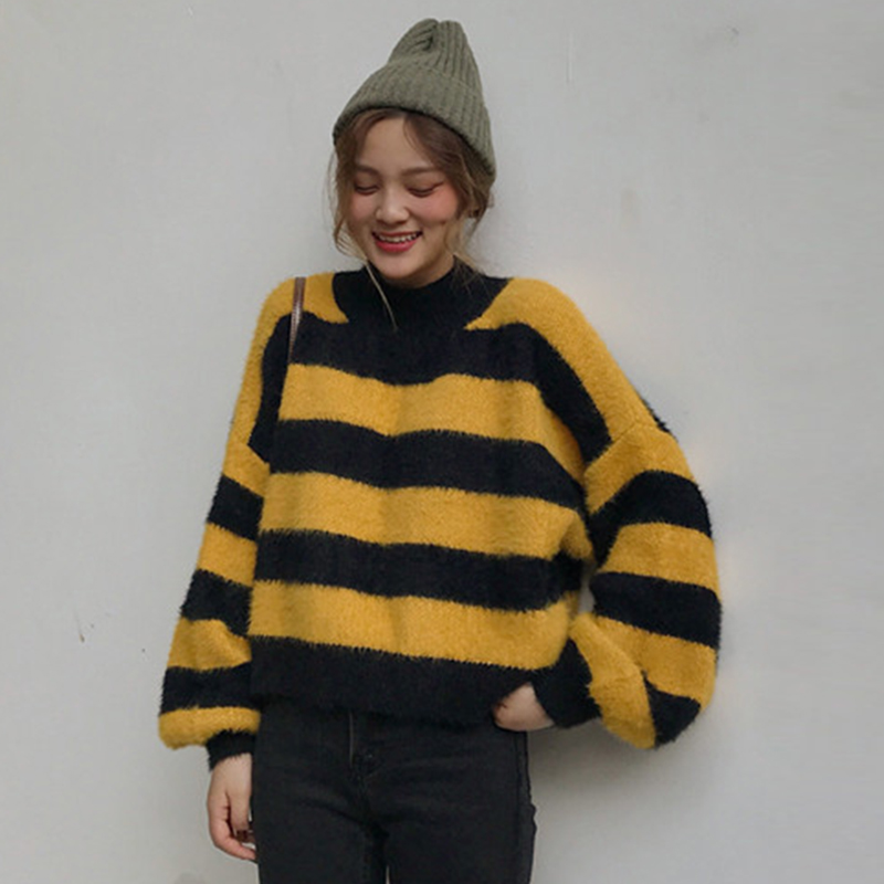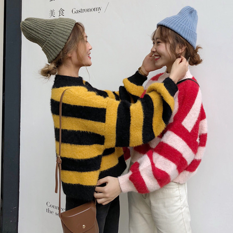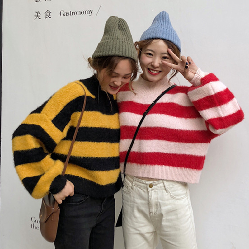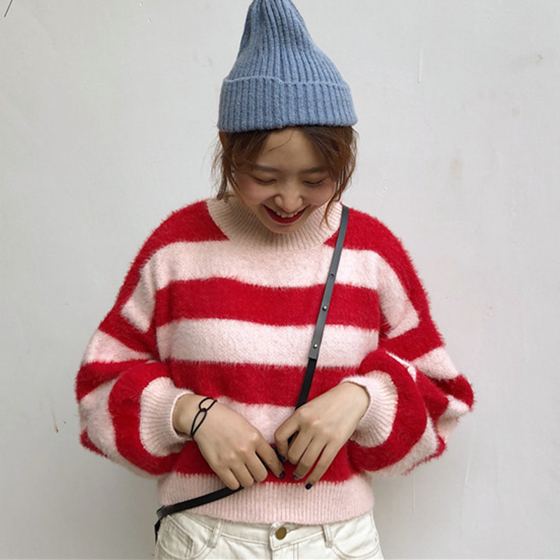 時尚拼色條紋慵懶毛衣女秋冬裝2018新款圓領針織外套寬松長袖上衣